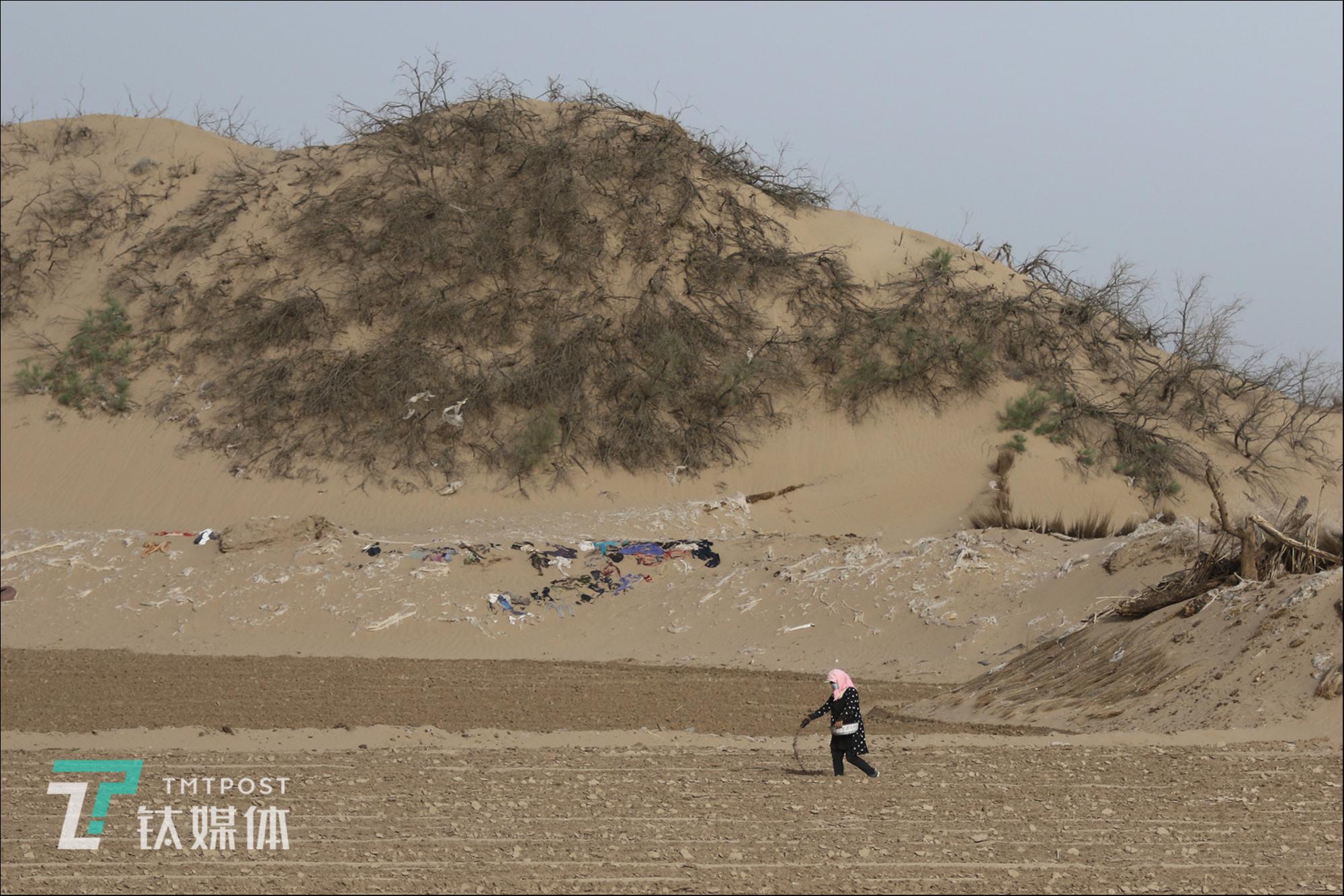 2019年5月18日,民勤縣收成鎮(zhèn)禮智村,沙漠邊一片尚未播種的蜜瓜地,瓜農(nóng)在撒化肥,瓜地邊的沙坡鋪滿了用于固沙的薄膜和廢舊衣服。