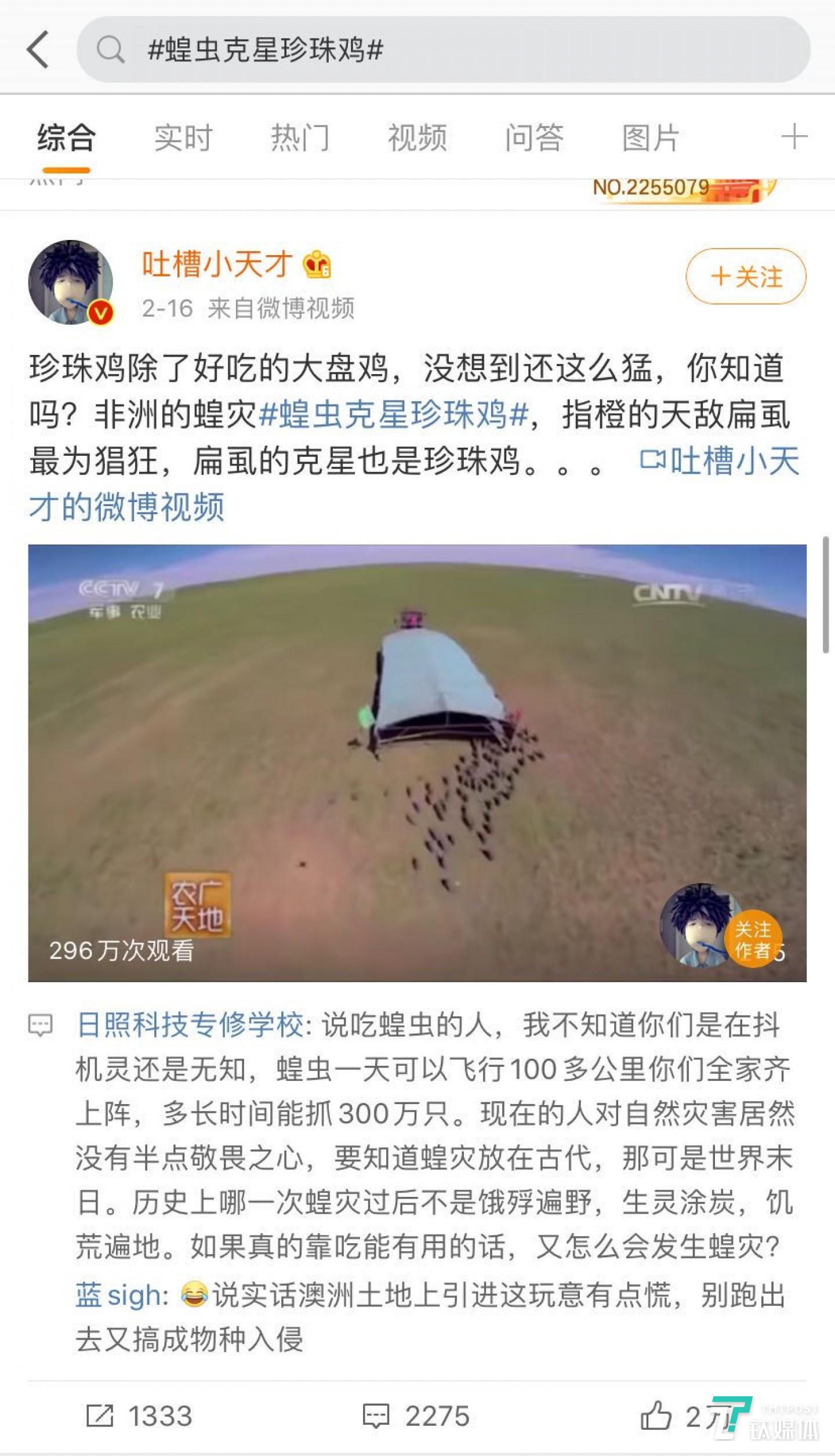 而微博上也有一種論調,稱沙漠蝗進入中國也沒事,我們早就有了絕招:放雞鴨吃蝗蟲,綠色環(huán)保,雞鴨肥了還能賣錢。微博甚至出現了熱門話題#蝗蟲克星珍珠雞#。