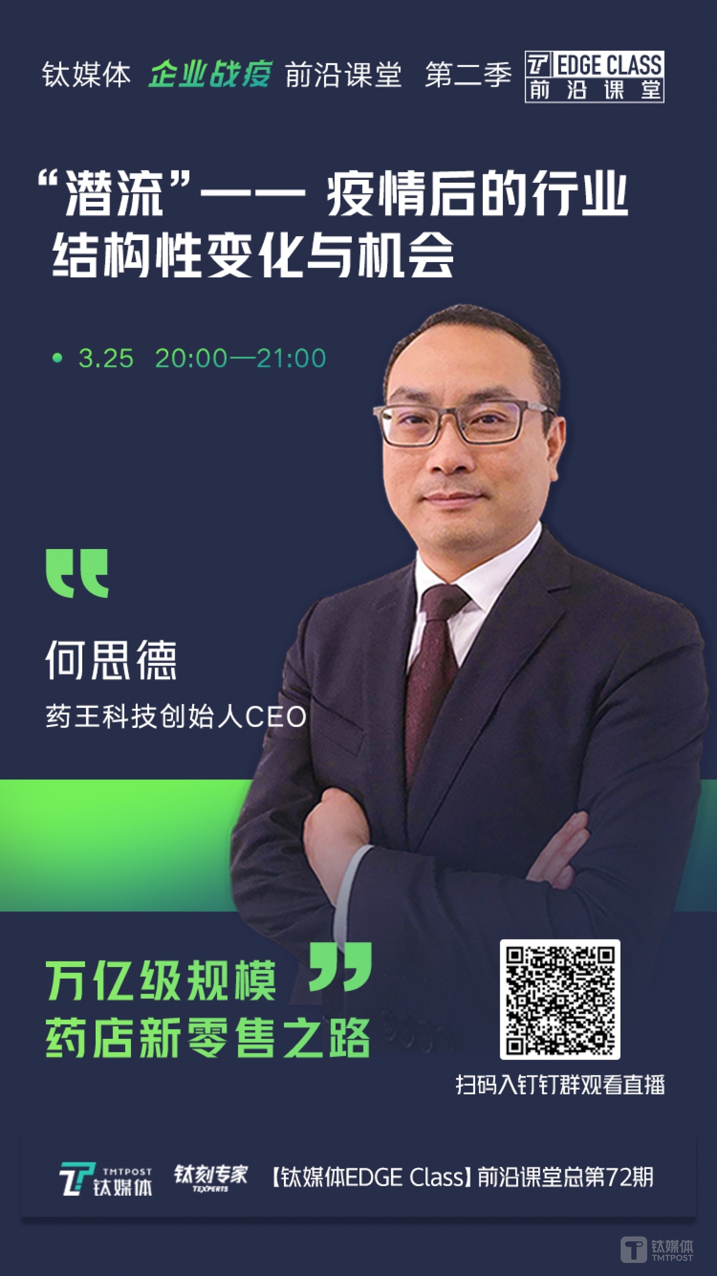 在鈦媒體以“潛流——疫情后的行業(yè)結(jié)構(gòu)性變化與機(jī)會(huì)”為主題的“企業(yè)戰(zhàn)疫”前沿課堂第一季上,藥王科技創(chuàng)始人兼CEO何思德分享其23年藥品供應(yīng)鏈信息化及管理咨詢工作經(jīng)驗(yàn),圍繞醫(yī)藥行業(yè)數(shù)字化轉(zhuǎn)型以及新形勢(shì)對(duì)醫(yī)品行業(yè)的影響等展開講述。(點(diǎn)擊鏈接查看直播回放