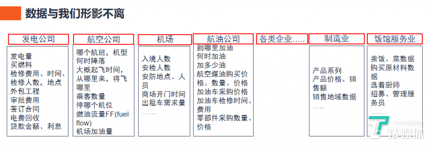 另外,企業(yè)數(shù)據(jù)其實(shí)更多的來自于我們?nèi)粘I(yè)務(wù)工作中,比如航空公司飛機(jī)起降時(shí)間、客流量、加油數(shù)據(jù),比如機(jī)場(chǎng)的安檢數(shù)據(jù)等等。