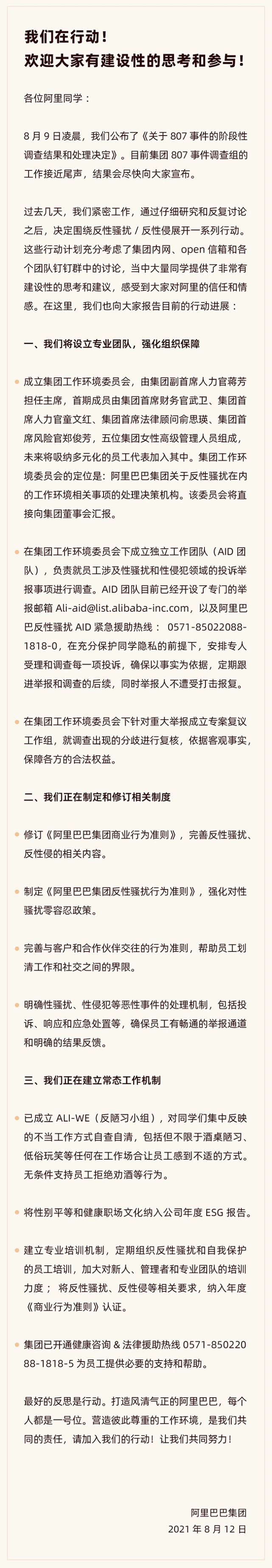 阿里巴巴還透露,將定期組織反性騷擾和自我保護的員工培訓,目前已開通健康咨詢和法律援助熱線,為員工提供必要的支持和幫助。