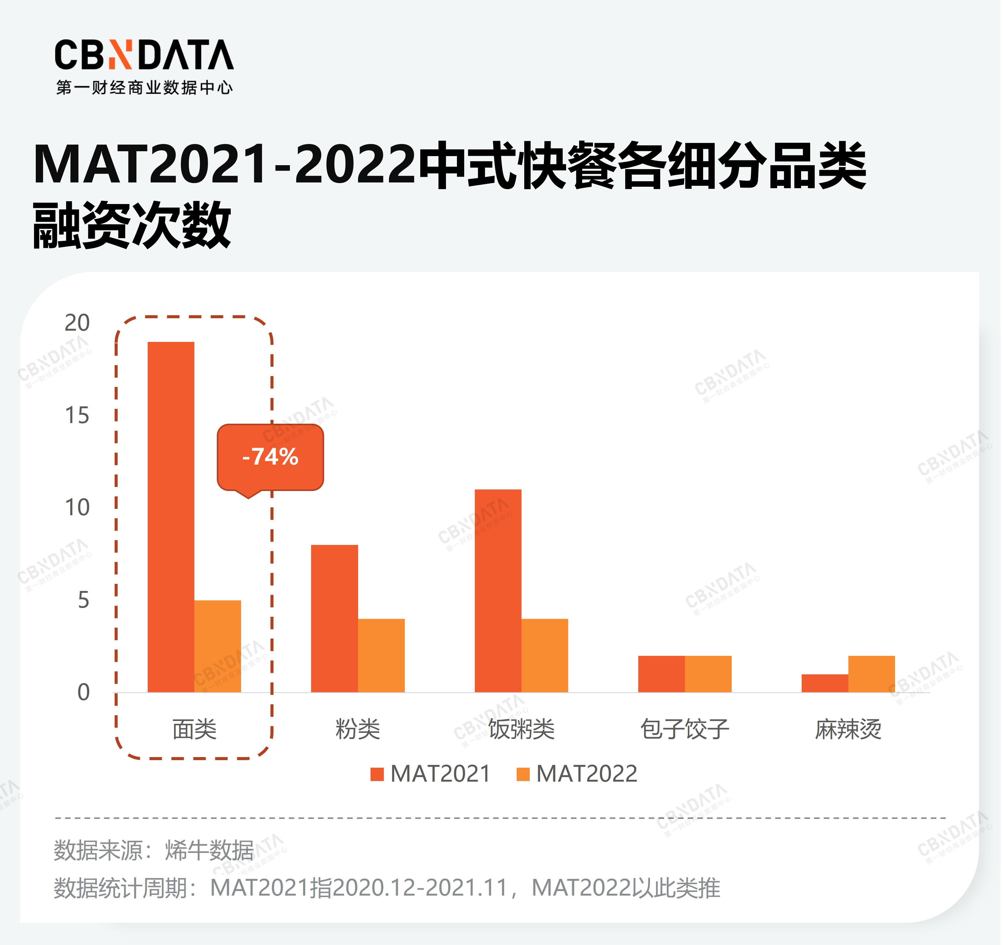 與此同時,高估值的提前透支,也讓資本不再買單。去年頻繁融資的網(wǎng)紅面館今年普遍“啞火”,行業(yè)內(nèi)最新的融資消息停留在新一輪疫情前的1月底。根據(jù)烯牛數(shù)據(jù),MAT2022周期內(nèi),中式快餐是所有餐飲品類中融資次數(shù)下滑最明顯的品類。而中式快餐賽道中,又以面館的資本次數(shù)下滑最明顯,融資次數(shù)對比MAT2021年同期大跌74%。