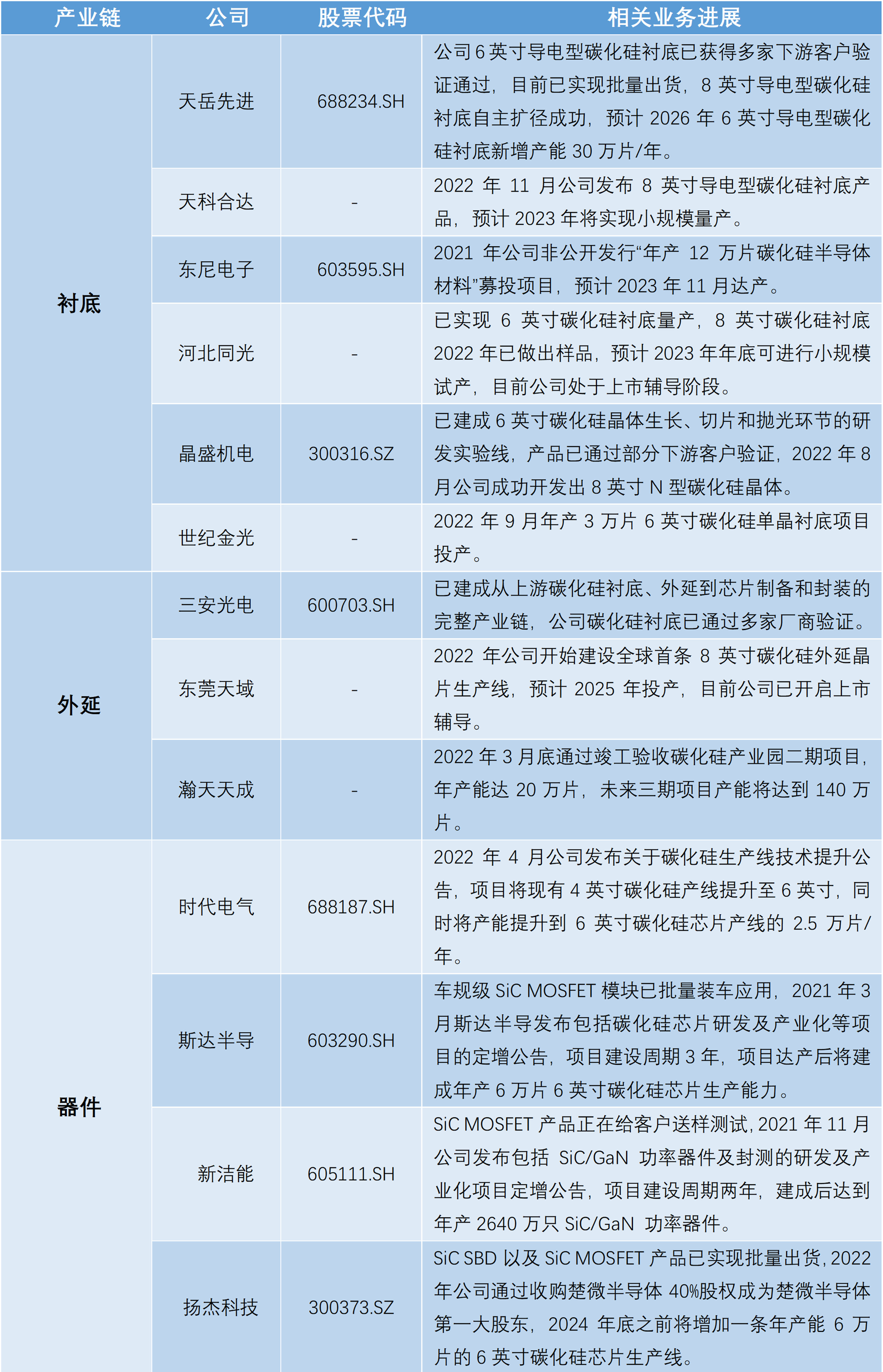 器件環(huán)節(jié),產(chǎn)業(yè)鏈上相關公司包括時代電氣、斯達半導、新潔能、揚杰科技以及三安光電等。