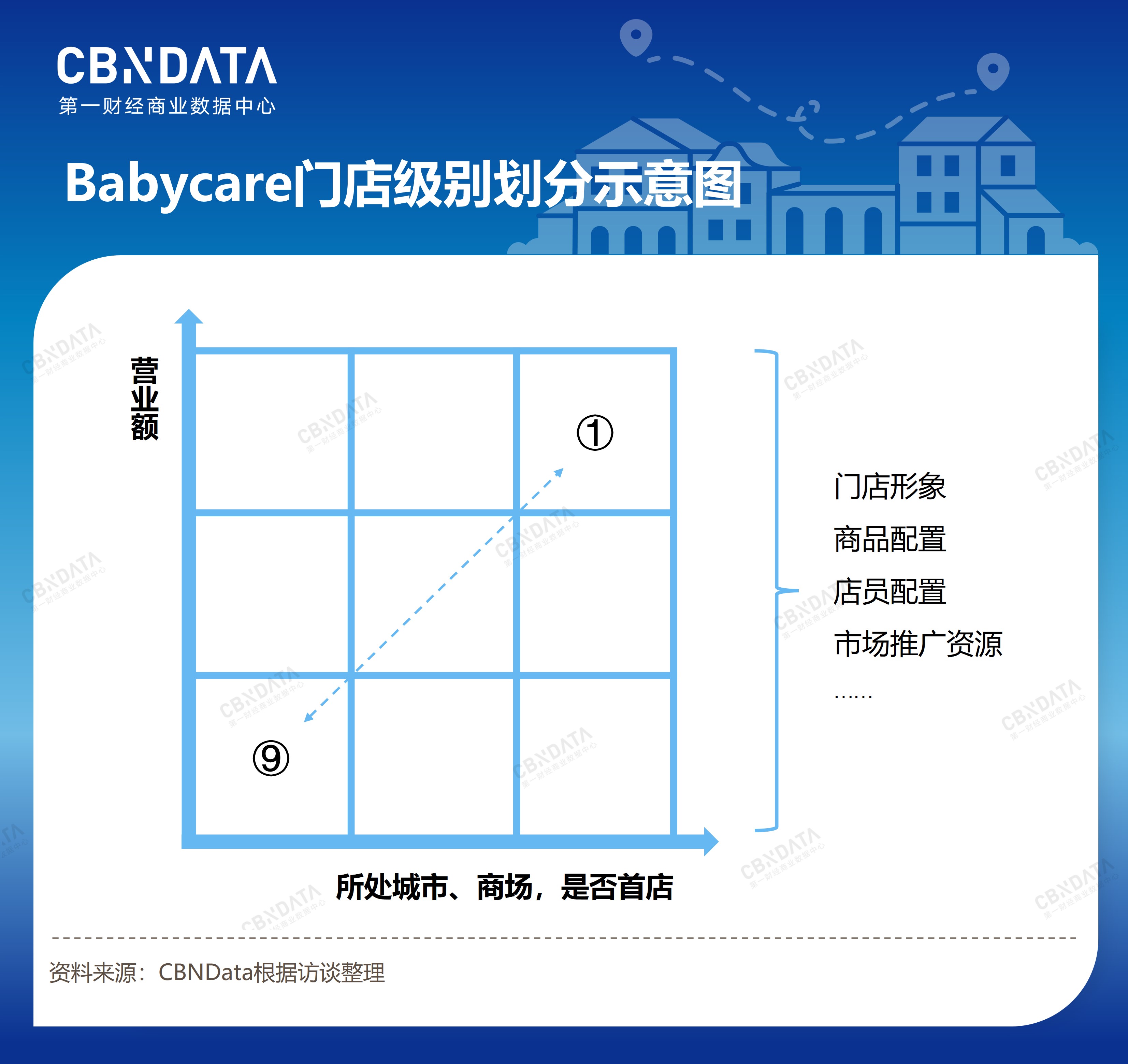 Babycare的做法是精細(xì)化管理門店,公司內(nèi)部有專門的商品策略團(tuán)隊(duì),他們從品牌和銷售額兩個(gè)維度出發(fā),根據(jù)門店所在城市、商場級別,是否全國/區(qū)域/城市首店,以及營業(yè)額高低等,將門店劃分為9個(gè)級別。不同級別門店的門店形象、商品配置、店員配置和市場推廣資源投入程度都有所不同。