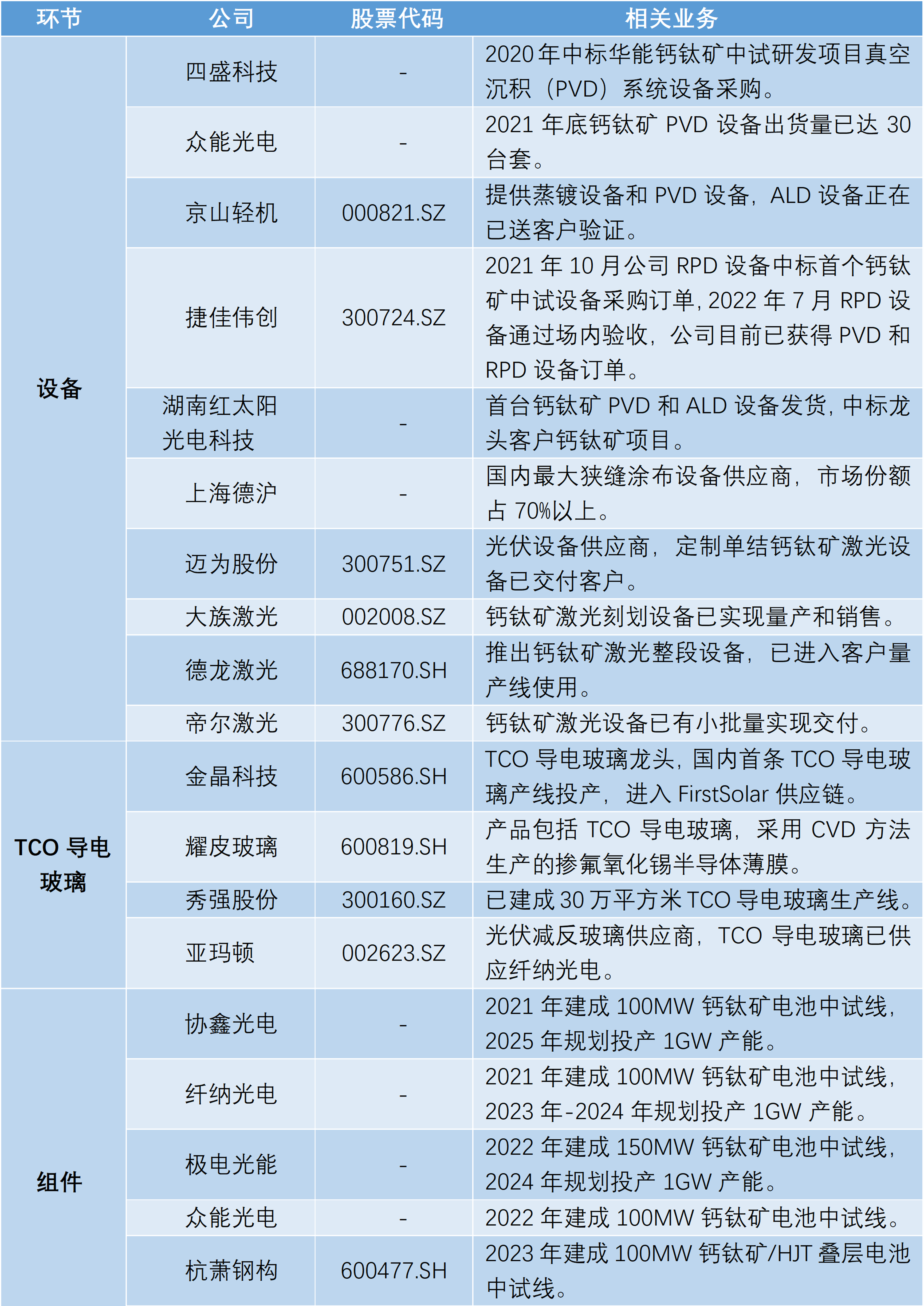 PVD設(shè)備除了在鈣鈦礦電池生產(chǎn)中需要,在晶硅電池等其他行業(yè)同樣應(yīng)用廣泛,設(shè)備供應(yīng)商包括四盛科技、眾能光電、京山輕機(jī)、捷佳偉創(chuàng)以及湖南紅太陽光電科技等;狹縫涂膜設(shè)備方面上海德滬涂膜市占率達(dá)到70%,其余份額為日本東麗;RPD設(shè)備方面供應(yīng)商包括捷佳偉創(chuàng)以及日本住友等;激光設(shè)備方面供應(yīng)商包括邁為股份、大族激光、德龍激光和帝爾激光等。
