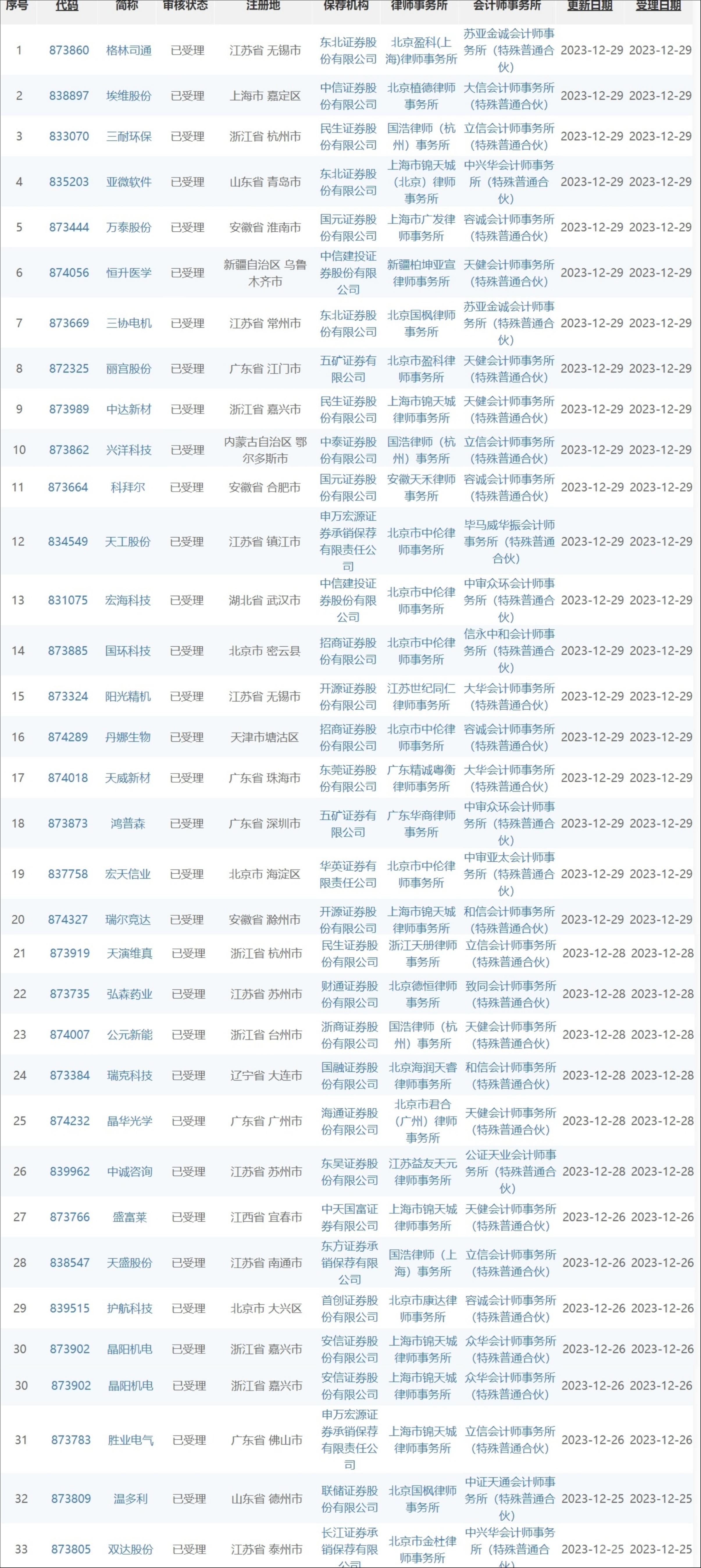 上周北交所還迎來(lái)IPO受理“小高峰”,僅2023年收官日當(dāng)天(12月29日),就有超20家企業(yè)IPO申請(qǐng)獲受理,周內(nèi)累計(jì)有33家企業(yè)上市申請(qǐng)獲受理。