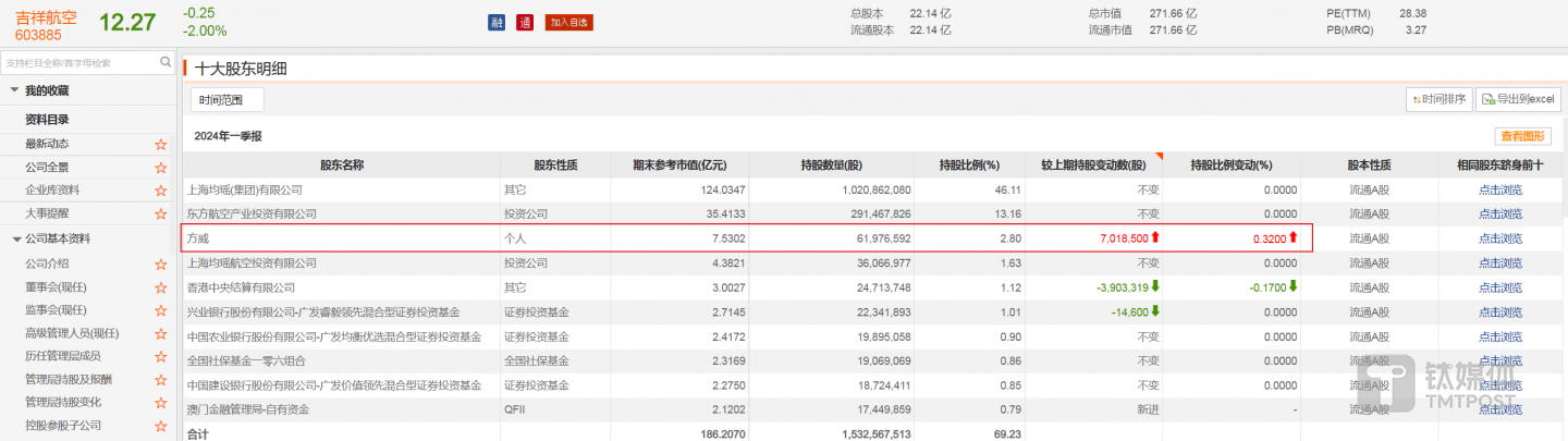 除控股公司投資之外,方威更是親自下場(chǎng)投資。2022年8月,方威成為吉祥航空第六大股東,此后一直選擇蟄伏。直到2023年底,方威一躍成為吉祥航空第三大股東,持股比例為2.48%。此后方威仍選擇不斷加倉,2024年一季報(bào)顯示,方威持有吉祥航空6197萬股股份,持股比例為2.8%。