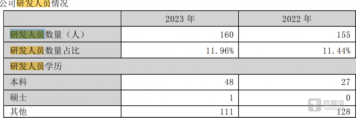 截至2023年底,公司擁有160名研發(fā)人員,其中碩士僅1人,本科48人,其他學歷111人。更為關鍵的是,公司核心技術人員非常少,而且受教育程度一般。據(jù)招股書顯示,公司4名核心技術人員中3名為本科學歷、1人為大專學歷。