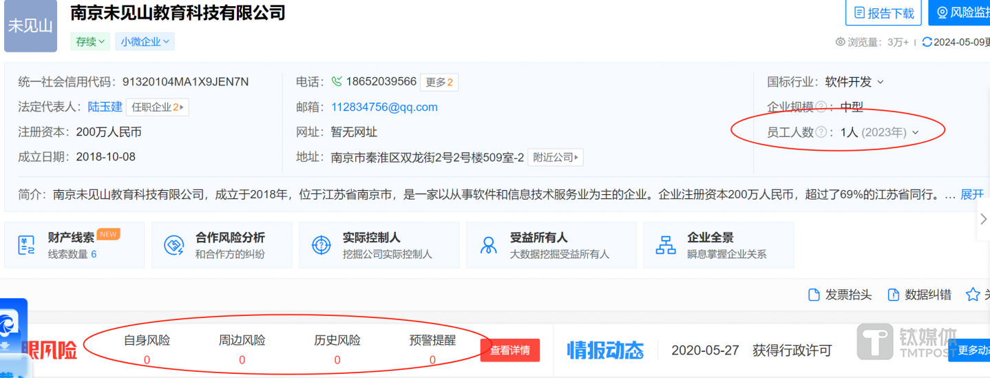 值得注意的是,盛思科教的客戶卻疑似“空殼公司”。據(jù)了解,盛思科教2021年向前五大客戶之一南京未見山教育科技有限公司(下稱“南京未見”)銷售337.21萬元商品。天眼查顯示,南京未見成立于2018年,參保人數(shù)為1人,甚至自身風險、周邊風險、歷史風險、預警提醒等均為0。同樣作為2021年盛思科教前五大客戶之一的杭州米欣和智能科技有限公司與南京未見情況也差不多。
