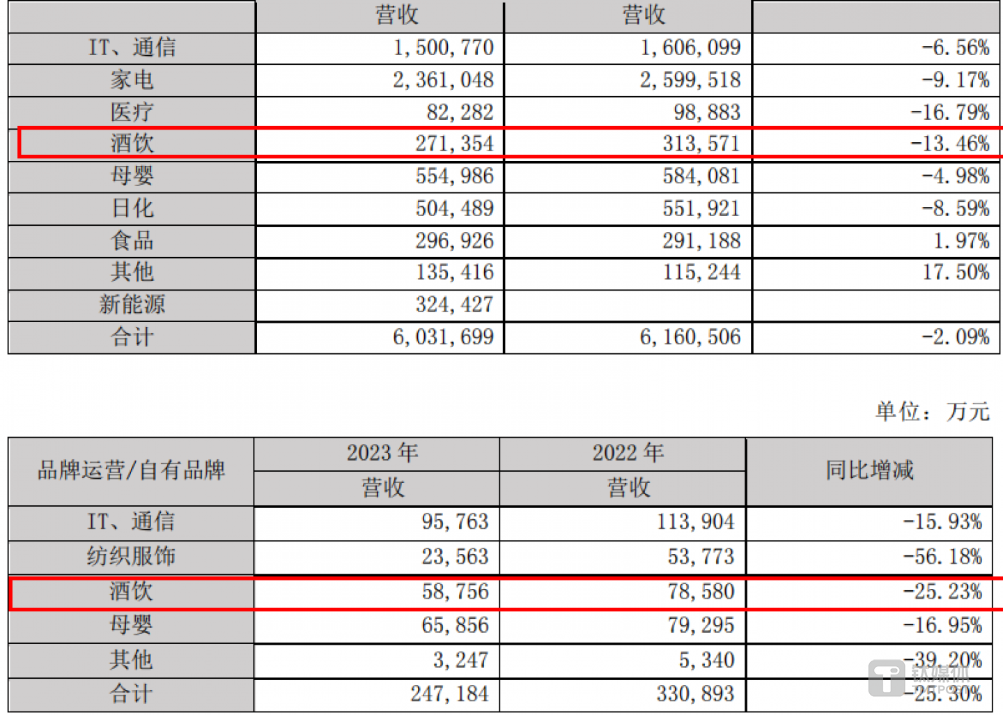 只是,轉(zhuǎn)型清香型白酒業(yè)務(wù)也并未給公司帶來(lái)顯著的業(yè)績(jī)提升。2023年財(cái)報(bào)顯示,酒飲供應(yīng)鏈業(yè)務(wù)的營(yíng)收為27.14億元,同比下降13.46%;而酒飲品牌運(yùn)營(yíng)/自有品牌的營(yíng)收為5.88億元,同比下降25.23%。