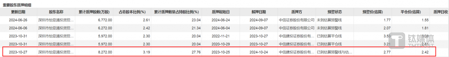 鈦媒體APP注意到,怡亞通控股之所以補(bǔ)充質(zhì)押是有部分股票質(zhì)押已到預(yù)警線(估算)2.77元/股,存在平倉(cāng)風(fēng)險(xiǎn)。截至6月25日收盤,公司股價(jià)為2.77元,總市值71.94億元。