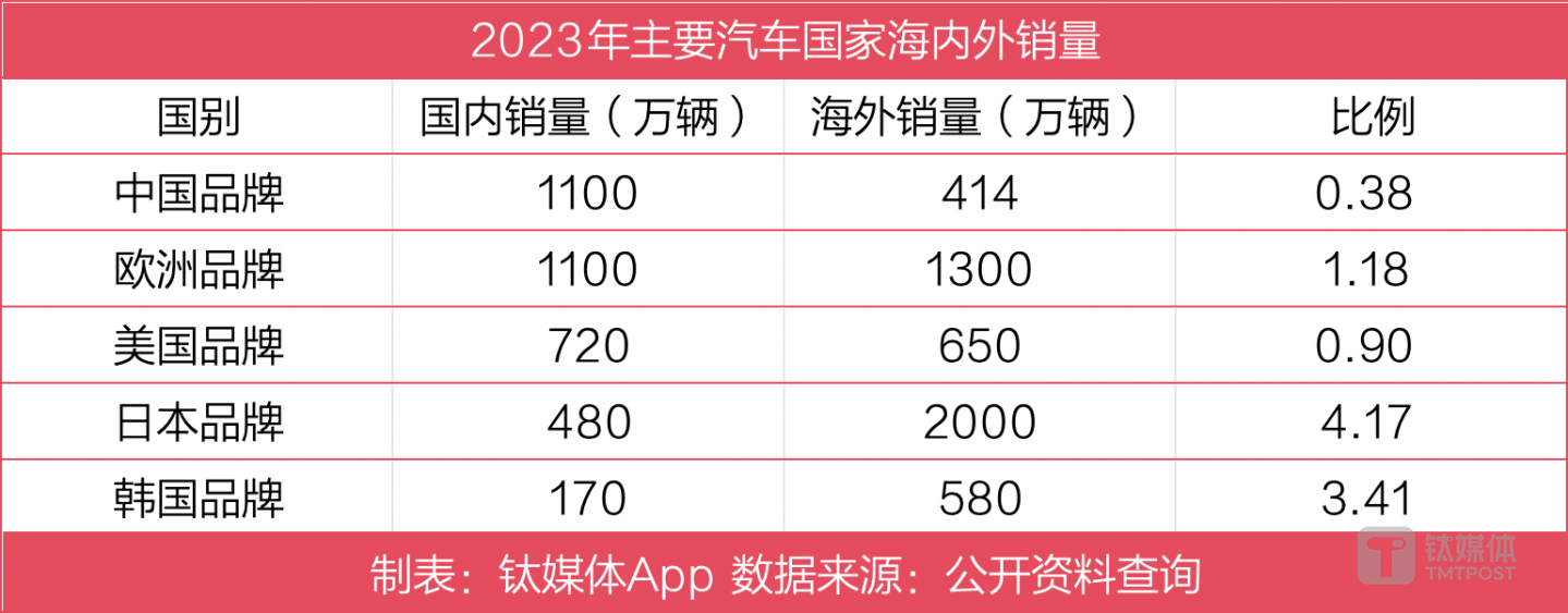 數(shù)據(jù)顯示,2023年中國(guó)品牌海外銷量?jī)H為國(guó)內(nèi)銷量的0.38。作為比較,日本品牌的海外銷量占比最高,是國(guó)內(nèi)銷量的4.17倍,韓國(guó)品牌緊隨其后為3.41,歐洲品牌和美國(guó)品牌的海外銷量分別是國(guó)內(nèi)銷量的1.18倍和0.9倍。