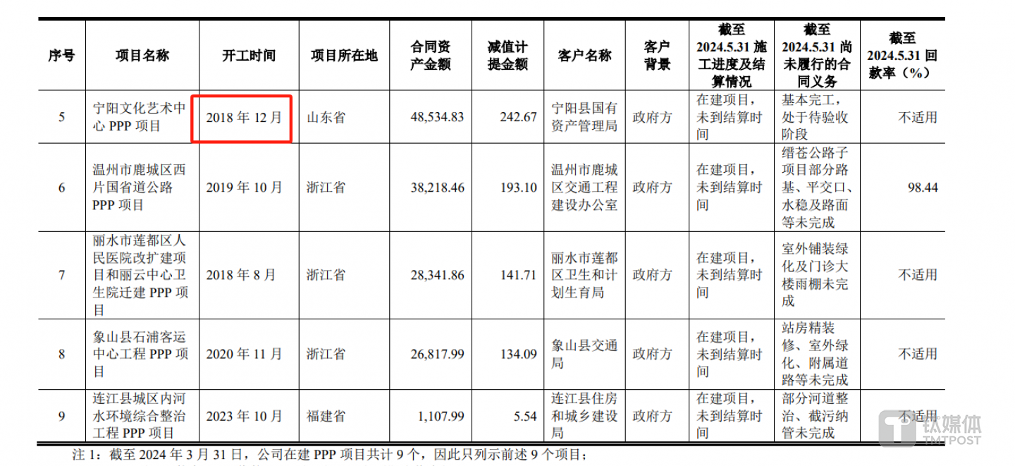 再具體細看,龍元建設(shè)的合同資產(chǎn)主要為金融資產(chǎn)模式的在建 PPP 項目和在建以及完工未結(jié)算的建筑總承包項目。鈦媒體APP了解到,此前,龍元建設(shè)接盤了不少PPP項目,截至2024年3月31日,公司在建PPP項目仍有9個,其施工情況均顯示為“在建項目,未到結(jié)算時間。”但從開工時間看,有的項目甚至起于2018年,至今已有6年時間,卻仍未完成。