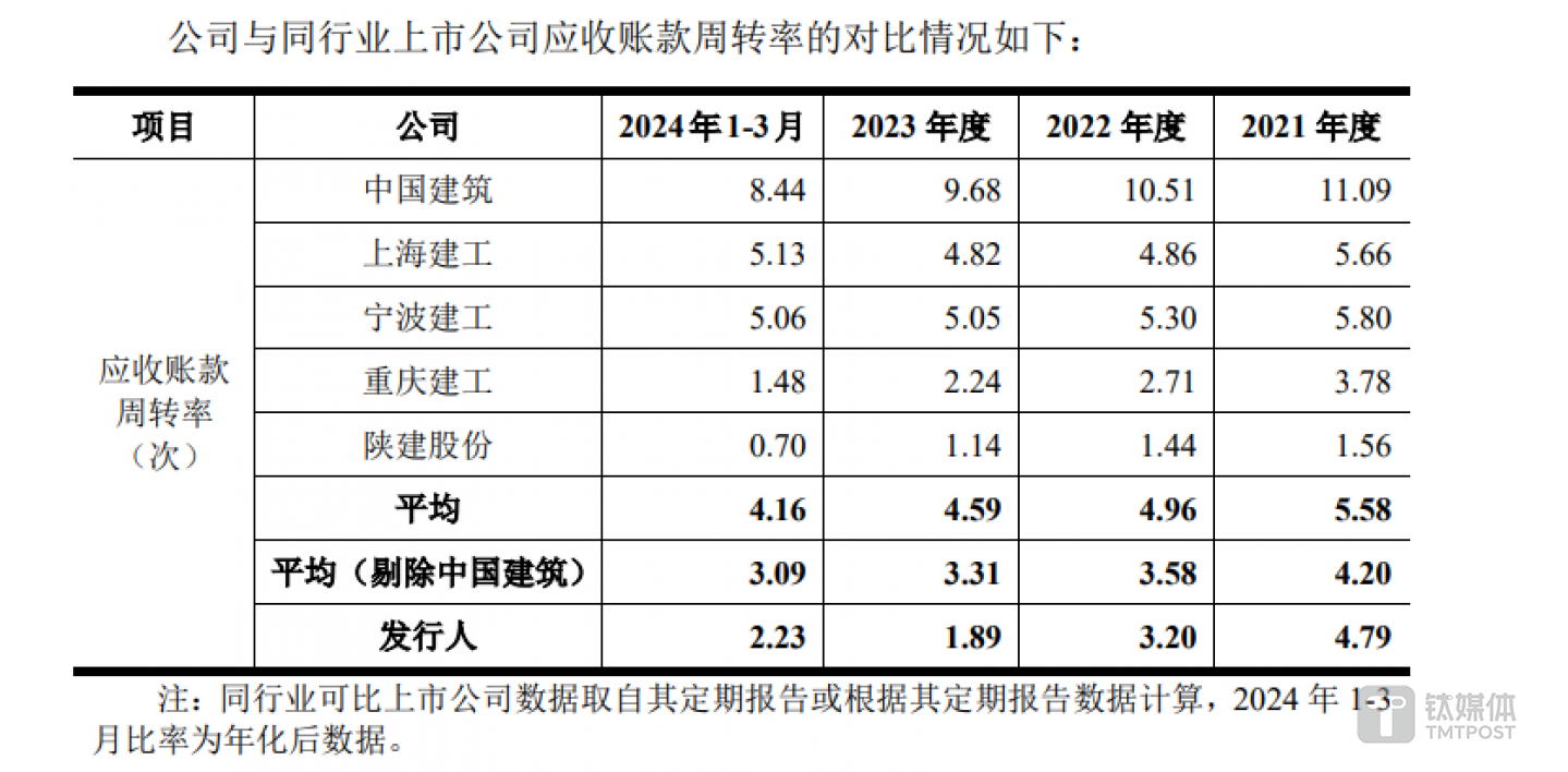 另外值得一提的是,龍元建設(shè)目前的應(yīng)付賬款達到107.1億元,但應(yīng)收賬款卻只有47.31億元,兩者之間差別巨大。此外,2020年—2023年以及今年第一季度,公司應(yīng)收賬款周轉(zhuǎn)率分別為4.79%、3.20%、1.89%和2.23%(年化),呈下降趨勢,且遠低于行業(yè)平均水平。