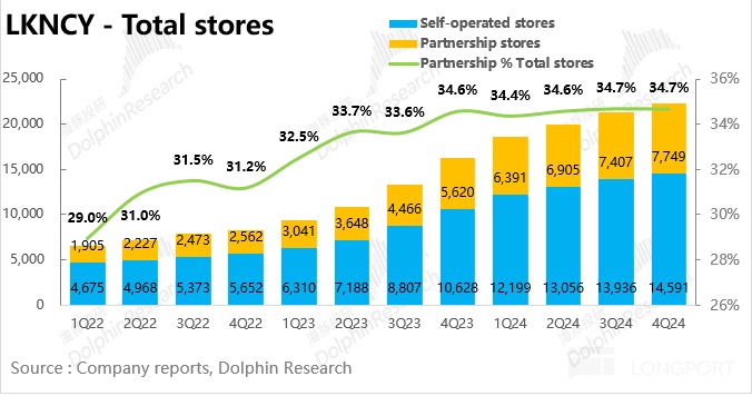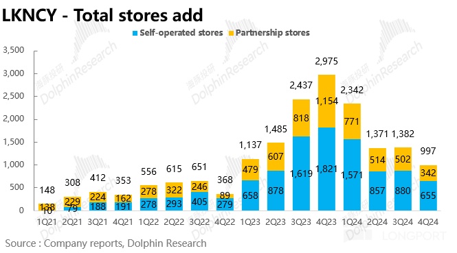 從開店數(shù)量上看,瑞幸 24Q4 環(huán)比 Q3 凈新增 997 家門店,其中自營門店/加盟門店分別凈新增 655 家/342 家,增速較 Q2、Q3 持續(xù)放緩,接近 2023 年價格戰(zhàn)以前水平(為了應(yīng)對庫迪的 9.9 價格戰(zhàn) + 高速開店,瑞幸在 2023 年加快了開店速度搶占優(yōu)質(zhì)點位),側(cè)面印證了庫迪對瑞幸的威脅在持續(xù)減弱。