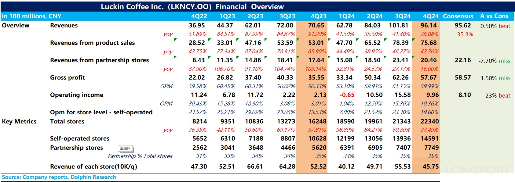 瑞幸咖啡(LKNCY)于北京時間 2025 年 2 月 20 日下午美股盤前發(fā)布了 2024 年第四季度財報(截止 2024 年 12 月),在營收略超預(yù)期的基礎(chǔ)上核心經(jīng)營利潤大超市場預(yù)期,背后的本質(zhì)在于瑞幸開店速度放緩后單店運營效率的提升,具體來看核心信息: