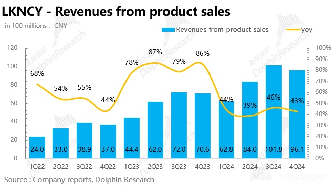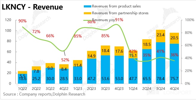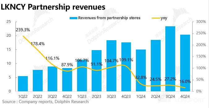 Q4 瑞幸實現(xiàn)總營收 96.1 億元,同比增長 36.1%,略超預(yù)期(市場一致預(yù)期 95.6 億元)。拆分業(yè)務(wù)來看,自營收入 76 億,依然在 40%+ 的高速增長中,但加盟因重點區(qū)域針對庫迪,對加盟商的大力度補貼,收入只是勉強超 20 億,同比增長只有 16%。
