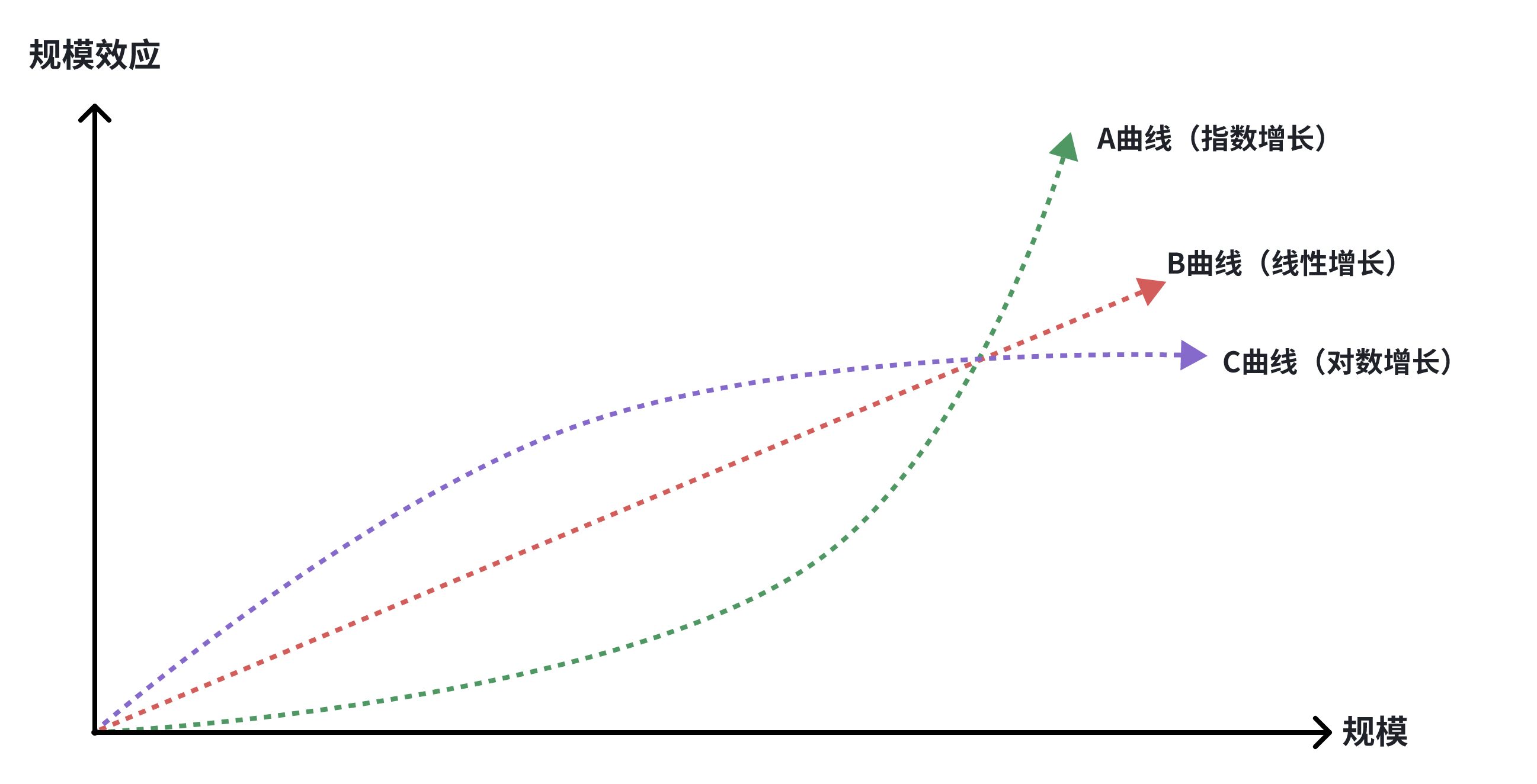 規(guī)模效應(yīng)有3種情況,一種是指數(shù)增長曲線(圖中A),一種是線性增長曲線(圖中B),一種是對數(shù)增長曲線(圖中C),不同的曲線也代表著不同的競爭態(tài)勢,進(jìn)一步也影響著行業(yè)的終局。