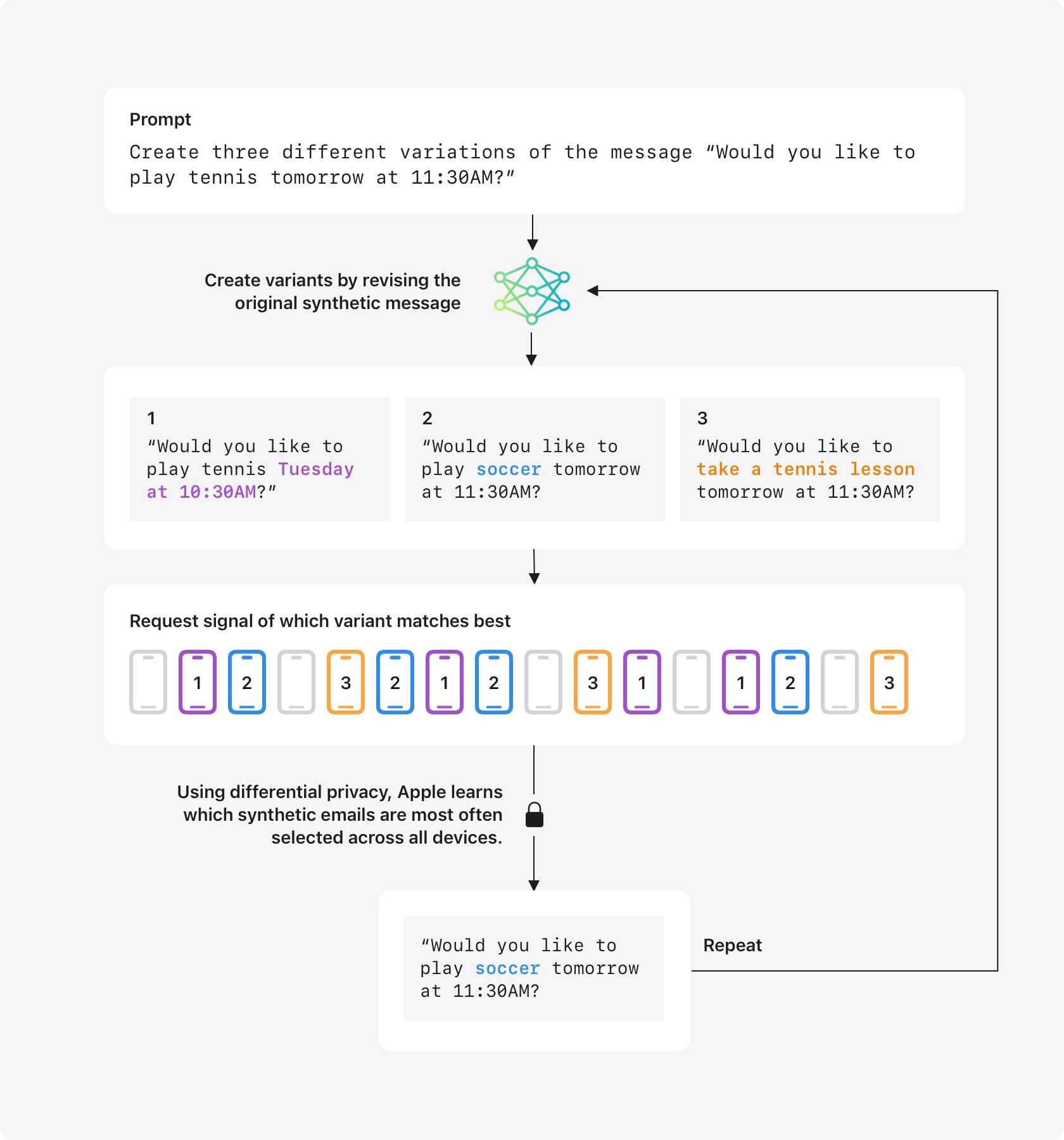 為解決數(shù)據(jù)收集的問題,蘋果在繼續(xù)打隱私安全牌的同時,給出了“差分隱私”(數(shù)據(jù)不會和個體一一對應(yīng))和采用合成數(shù)據(jù)的解法。