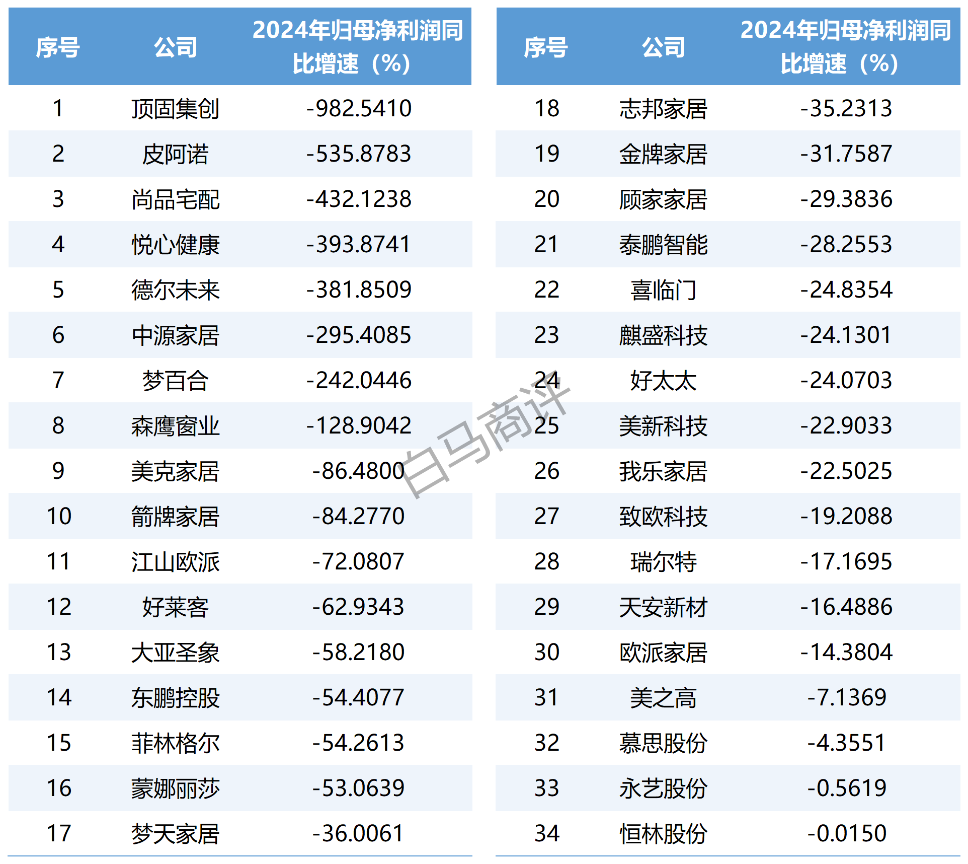 在A股上市的50家家居用品公司(不含其他家居用品)中,15家公司2024年歸母凈利潤(rùn)為虧損狀態(tài),34家公司增速同比下滑。
