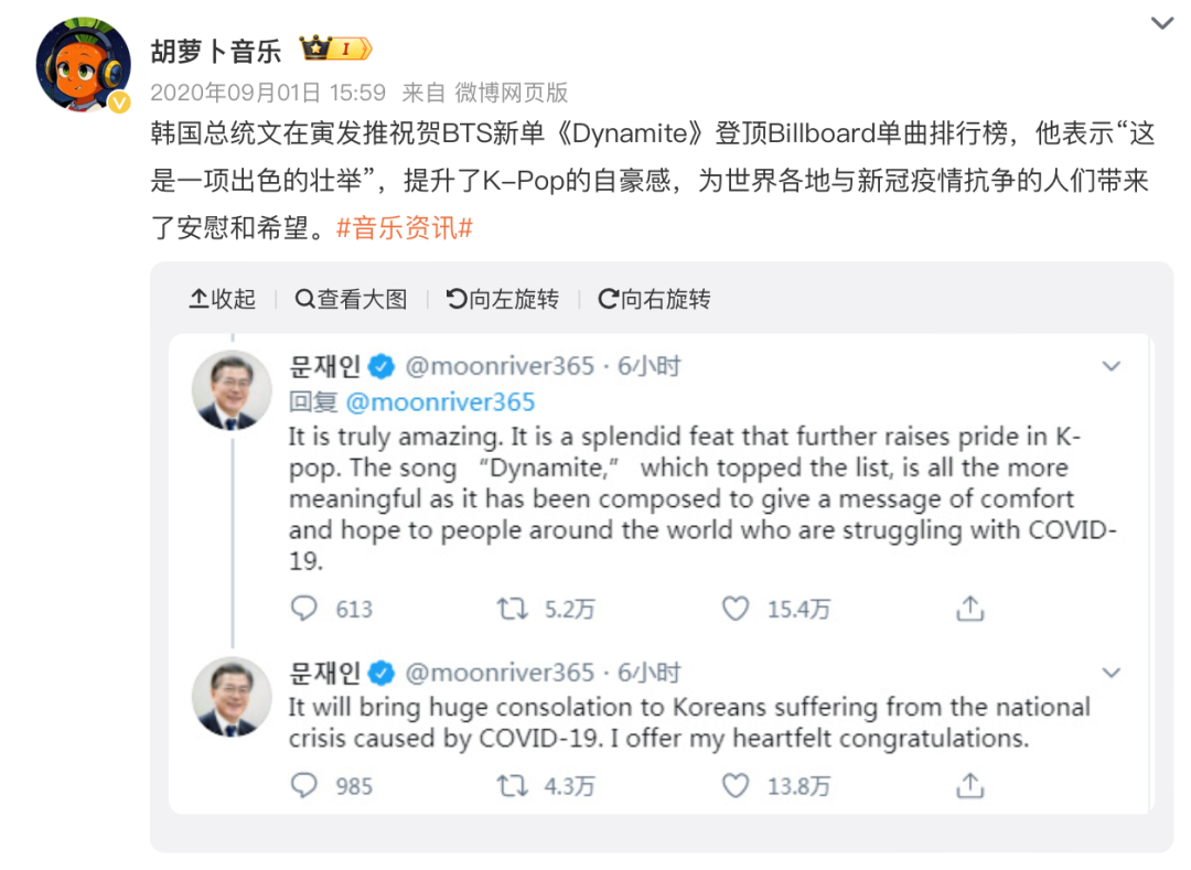 2020年,防彈少年團的英文單曲《Dynamite》空降 Billboard Hot 100 單曲總榜冠軍,文在寅隨后推文祝賀。這之后,韓國偶像們的禮物單曲常以全英文的形式出現(xiàn),不少團體也會在即將開啟歐美巡演時,發(fā)布一張全英專輯。