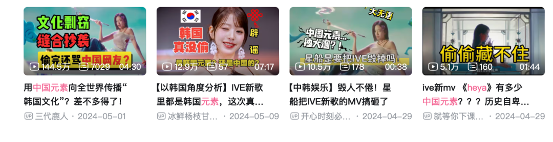 除了國家歷史層面的爭議,近些年來,文化挪用爭議也在中韓之間頻發(fā),涉及服飾、節(jié)日、歷史人物等等,其最嚴重的一次沖突莫過于2024年人氣女團IVE的MV《HEYA》。該女團宣稱制作理念是宣揚韓國文化,但其中卻用了中國結(jié)、祥云等大量中國文化元素。文化挪用爭議甚至蔓延至對歐美,導(dǎo)致「偷國」標簽成為輿論對韓國的刻板印象之一。