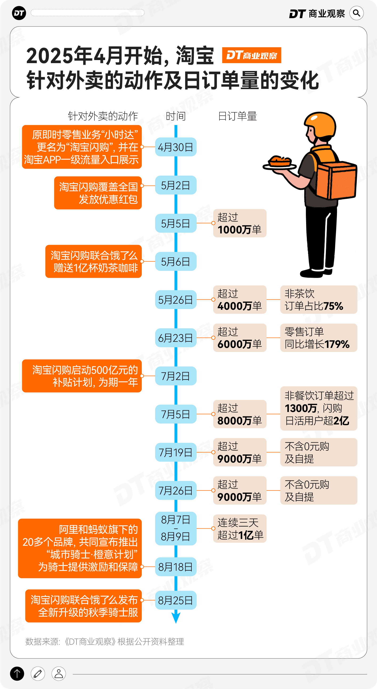 今年 8 月,淘寶閃購(gòu)的日訂單峰值達(dá)到1.2億單。要知道,在“外賣大戰(zhàn)”爆發(fā)前,今年年初整個(gè)市場(chǎng)的日均訂單總量才1億單。