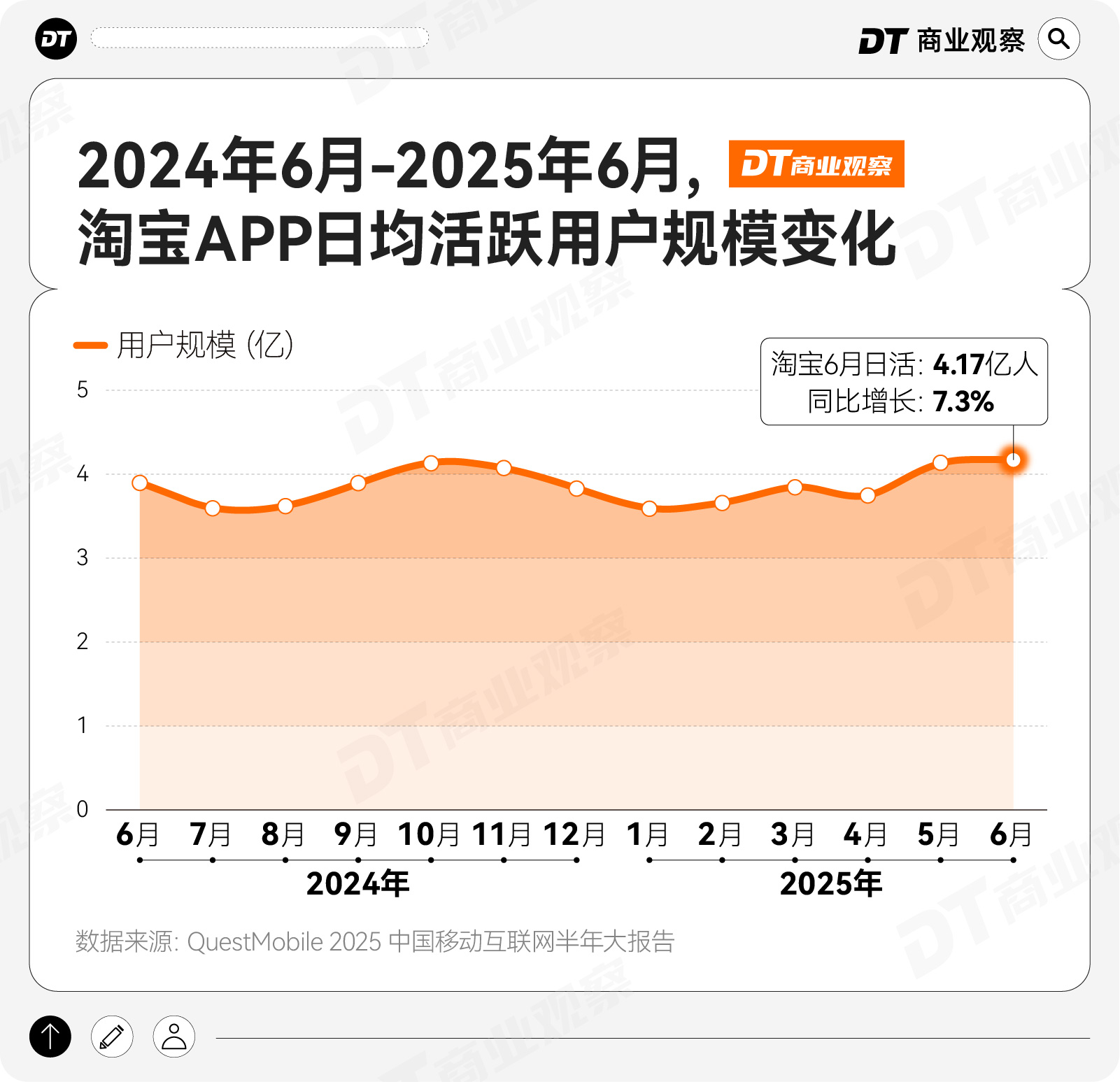 根據(jù)QuestMobile的數(shù)據(jù),淘寶APP今年6月的日活躍用戶規(guī)模達(dá)到4.17億,同比增長(zhǎng)7.3%。