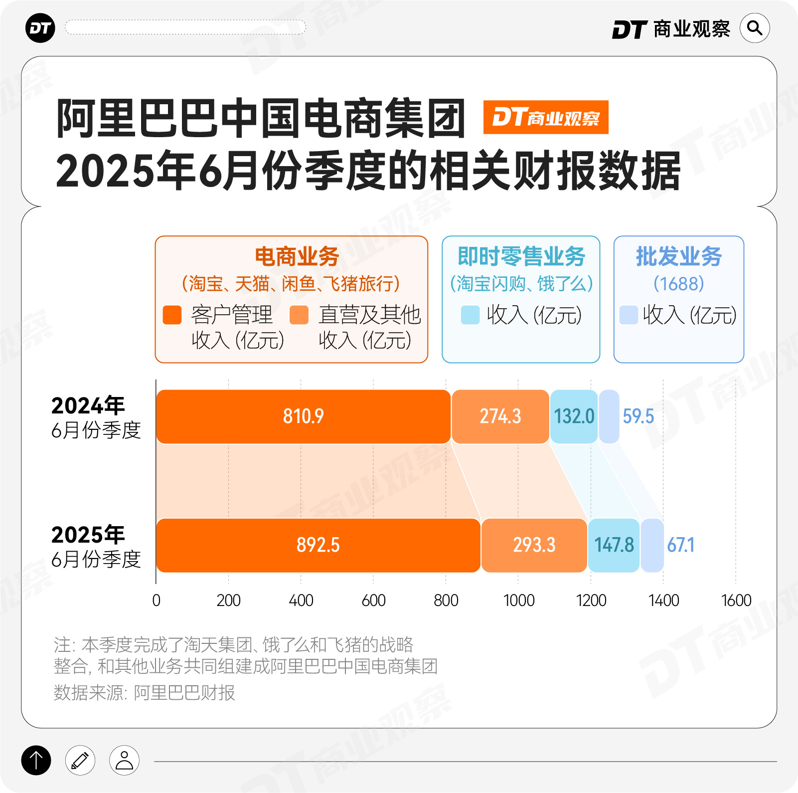 反映在財(cái)報(bào)上的,是各大業(yè)務(wù)的重新整合——把淘天集團(tuán)、餓了么和飛豬整合進(jìn)阿里巴巴中國(guó)電商集團(tuán),而菜鳥、高德和大文娛集團(tuán)被劃分至“其他”板塊。