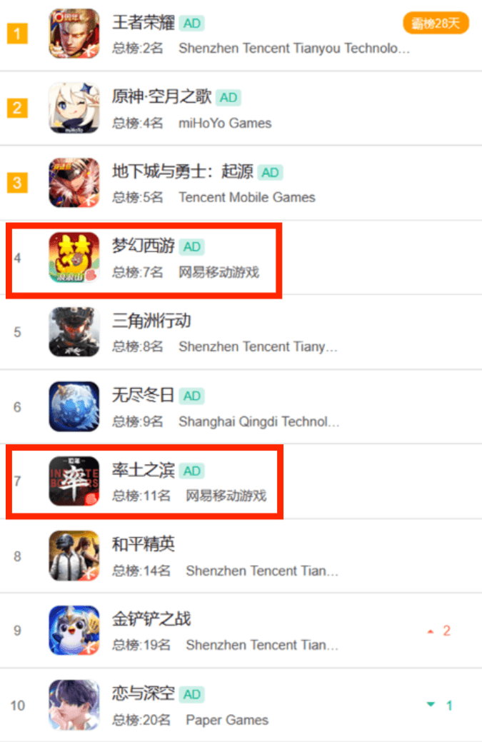 今日網(wǎng)易只有《夢(mèng)幻西游手游》與《率土之濱》進(jìn)入暢銷(xiāo)榜Top10行列