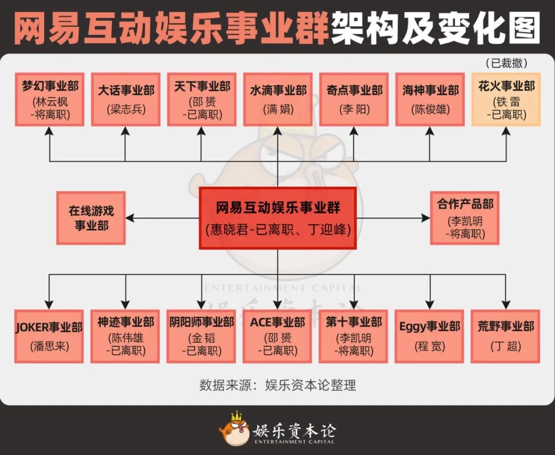 首先是2023年,網(wǎng)易互娛負(fù)責(zé)華東區(qū)域業(yè)務(wù)的聯(lián)席總裁惠曉君(天佑)被退休,接著網(wǎng)易游戲高級(jí)副總裁、天下事業(yè)部總裁邵赟(少云)于2024春節(jié)后離職,且天下事業(yè)部被一拆三分為Eggy事業(yè)部、荒野事業(yè)部與天下事業(yè)部。