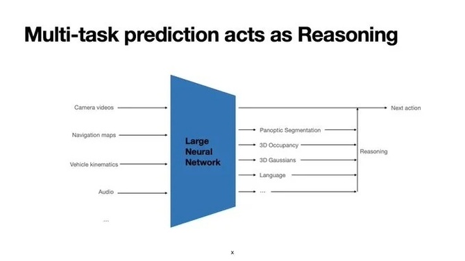 除此之外,特斯拉還引入了思維鏈COT(Chain-of-Thought),訓(xùn)練算法用自然語言來解釋自己的行為,并給出下一步的行動軌跡。這些中間結(jié)果,不僅可用于SR界面的渲染呈現(xiàn),同時也能用于研發(fā)校驗和調(diào)優(yōu),來保證模型輸出的正確性。