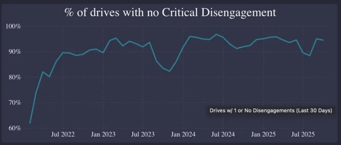 特斯拉無接管駕駛干預(yù)百分比,圖源Electrek