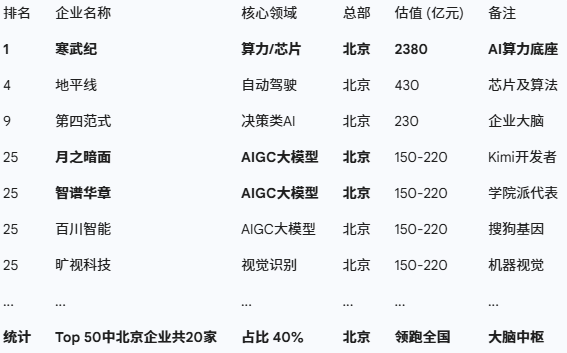 在2024胡潤中國人工智能企業(yè)50強中,北京以20家上榜企業(yè)的絕對優(yōu)勢碾壓全國,占據(jù)了四成席位 。寒武紀、第四范式、月之暗面、智譜華章,這些名字代表的是最強的大腦 。北京的邏輯是:只要我掌握了AGI通用人工智能的解釋權(quán),肉身不過是隨時可以替換的皮囊。