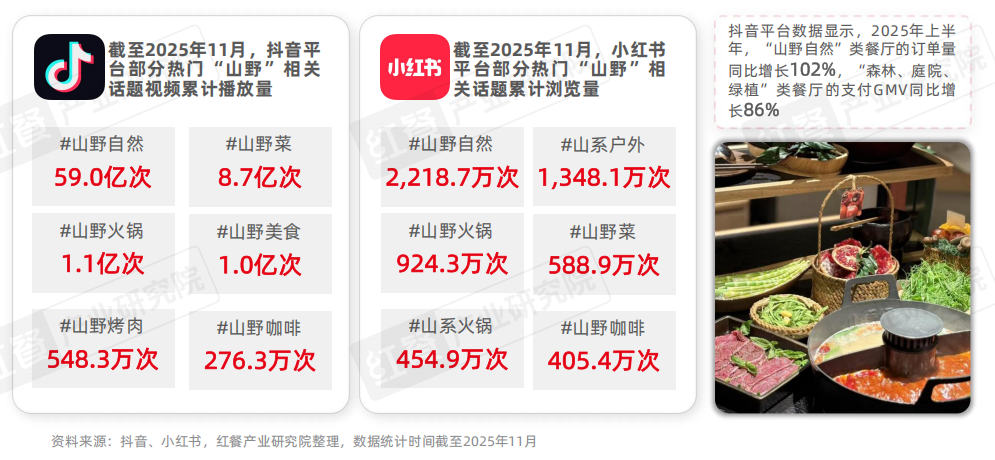自2023年以來,“山野”相關(guān)話題在抖音與小紅書等主流社交平臺(tái)持續(xù)升溫,展現(xiàn)出強(qiáng)勁的傳播勢(shì)能與內(nèi)容擴(kuò)散力。具體來看,截至2025年11月,抖音平臺(tái)上,“山野自然”“山野菜”“山野火鍋”等話題的視頻累計(jì)播放量已超億次級(jí)別,還有“山野烤肉”“山野咖啡”等多個(gè)熱門話題亦有百萬次播放量;小紅書平臺(tái)上,“山野自然”“山系戶外”等相關(guān)話題的累計(jì)瀏覽量均達(dá)到了千萬級(jí)別,“山野火鍋”“山野咖啡”等垂類話題的累計(jì)瀏覽量亦超過了百萬次。