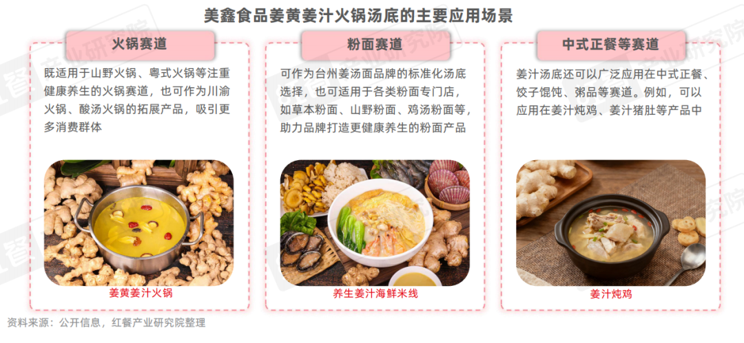 紅餐產(chǎn)業(yè)研究院進(jìn)一步了解到,姜湯火鍋湯底具有獨(dú)特的風(fēng)味和養(yǎng)生功效,適合應(yīng)用在多種餐飲場(chǎng)景中,如姜湯面、姜湯米線、姜湯雞煲、姜湯調(diào)蛋等。以美鑫食品推出的姜黃姜汁火鍋湯底為例,它不僅可以應(yīng)用到火鍋賽道,還可以靈活應(yīng)用到粉面、餃子餛飩、中式正餐等賽道。