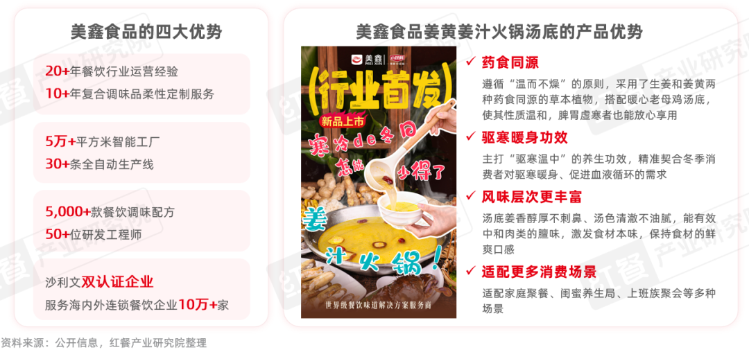洞察到以上痛點(diǎn),一些專業(yè)的供應(yīng)鏈企業(yè)對(duì)姜汁湯底進(jìn)行了研發(fā)。以美鑫食品為例,其洞察到了火鍋市場(chǎng)的這一趨勢(shì),并率先展開了姜汁火鍋湯底的標(biāo)準(zhǔn)化研發(fā),于2025年11月推出了姜黃姜汁火鍋湯底。