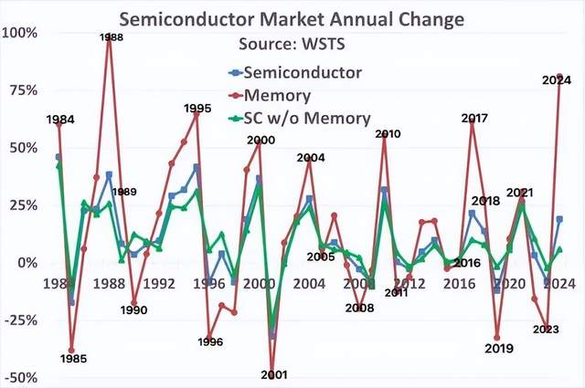 圖中針對半導體總量、存儲器市場以及剔除存儲器后的半導體市場進行了比較分析??梢郧逦乜吹?,存儲器市場呈現(xiàn)出極為劇烈的波動,曾有高達102%的增長幅度以及49%的下滑幅度等極端情況出現(xiàn),而與之形成鮮明對比的是,不包含存儲器的市場則表現(xiàn)得較為平穩(wěn),其波動區(qū)間處于增長42%至下滑26%之間。