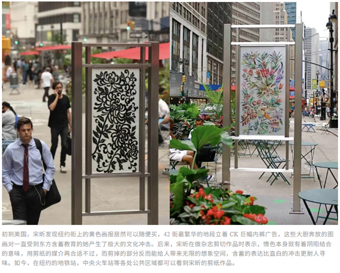 初到美國,宋昕發(fā)現(xiàn)紐約街上的黃色畫報居然可以隨便買,42 街最繁華的地段立著 CK 巨幅內(nèi)褲廣告,這些大膽奔放的圖畫對一直受到東方含蓄教育的她產(chǎn)生了極大的文化沖擊。后來,宋昕在做雜志剪切作品時表示,情色本身就有著陰陽結合的意味,用剪紙的媒介再合適不過,而剪掉的部分反而能給人帶來無限的想象空間,含蓄的表達比直白的沖擊更耐人尋味。如今,在紐約的地鐵站,中央火車站等各處公共區(qū)域都可以看到宋昕的剪紙作品。