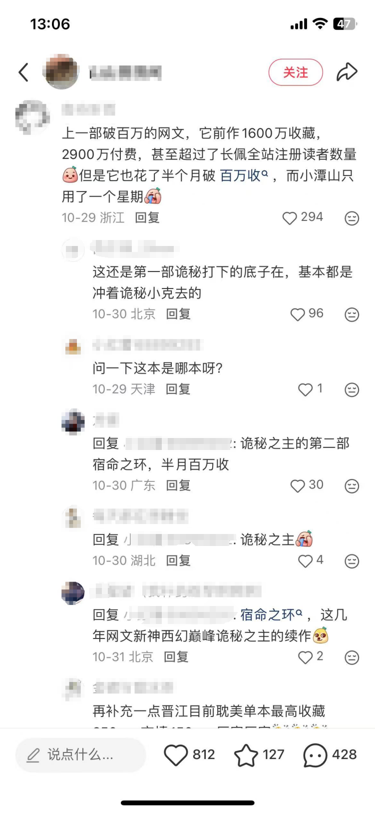 網(wǎng)友橫向?qū)Ρ劝l(fā)現(xiàn),上次達(dá)一周百萬(wàn)收成績(jī)的,是起點(diǎn)超頭部IP《詭秘之主》的續(xù)作《宿命之環(huán)》,而《詭秘之主》則是突破了起點(diǎn)網(wǎng)站歷史均訂,收藏破千萬(wàn)量級(jí)的作品。