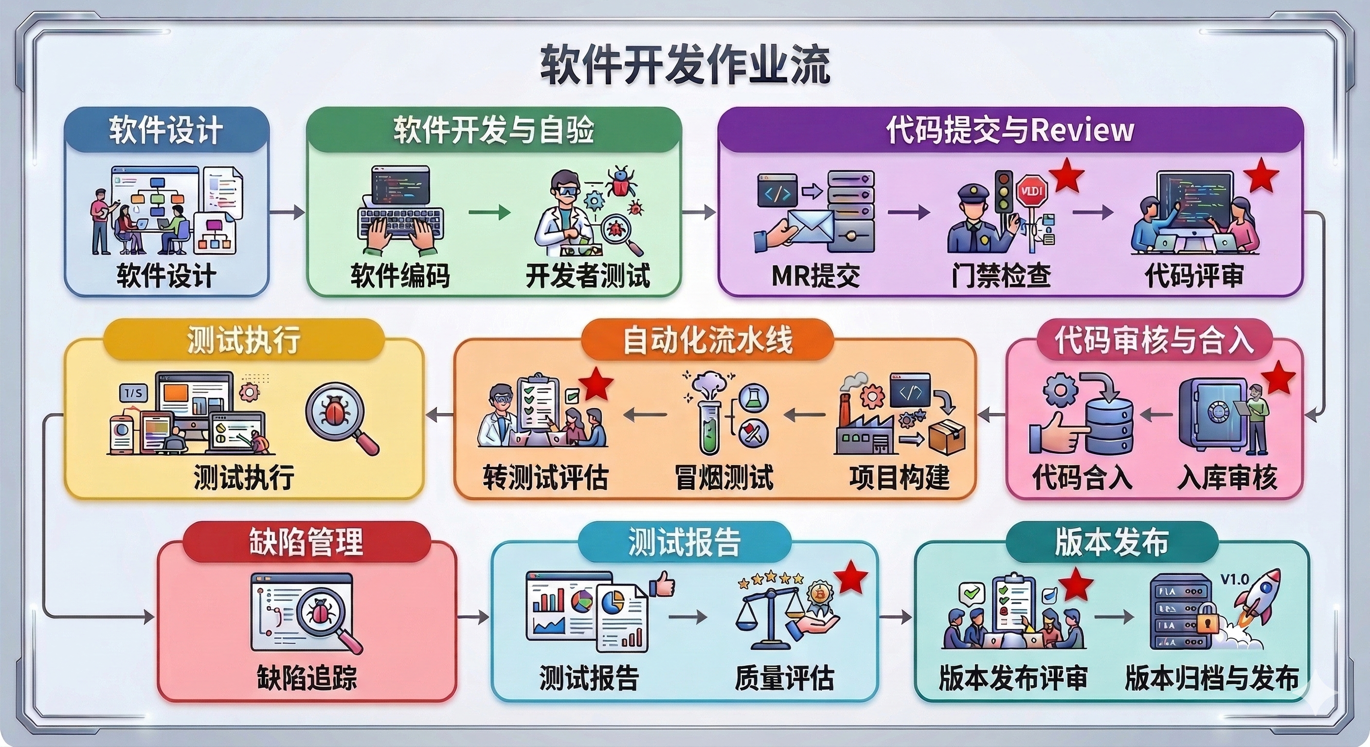 軟件開發(fā)作業(yè)流:整體可分為軟件設計、軟件開發(fā)與自驗、代碼提交與Review、代碼審核與合入、自動化流水線、測試執(zhí)行、缺陷管理、測試評估、版本發(fā)布等幾個大階段,通過設置審核檢查點控制和管理交付質量: