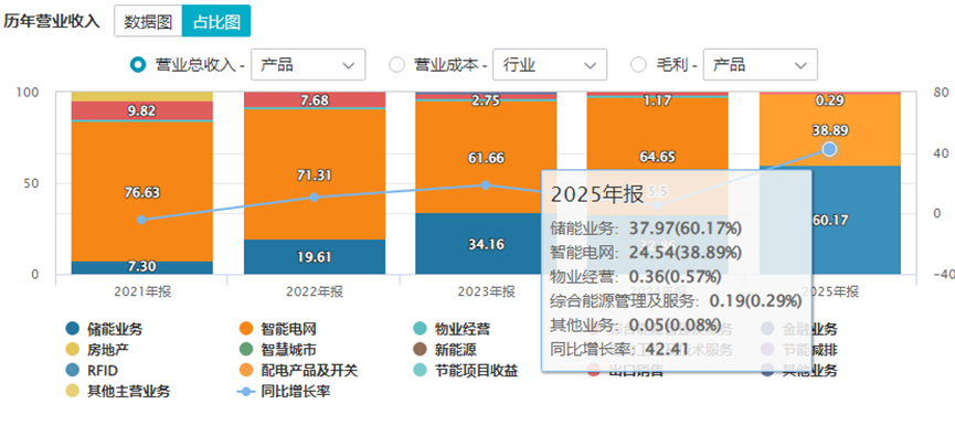 站在風(fēng)口上的儲能業(yè)務(wù),才是科陸電子現(xiàn)階段的發(fā)展核心。2025年儲能業(yè)務(wù)實(shí)現(xiàn)后來者居上,首次成為科陸電子的第一大業(yè)務(wù),營收占比高達(dá)60.17%。全年科陸電子儲能業(yè)務(wù)收入突破37.96億元,同比增長超160.74%,遠(yuǎn)高于行業(yè)平均增速。