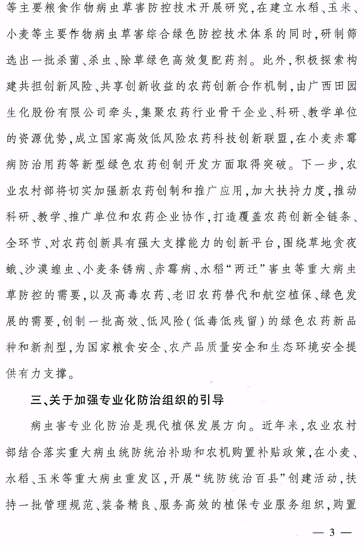 ? 創(chuàng)新驅動是做大做強農(nóng)藥產(chǎn)業(yè)的內在動力。近年來,農(nóng)業(yè)農(nóng)村部高度重視農(nóng)藥新產(chǎn)品創(chuàng)制及推廣應用,不斷加大農(nóng)藥研發(fā)投入,中央財政每年安排1680萬元,在現(xiàn)代農(nóng)業(yè)產(chǎn)業(yè)技術體系設立病蟲草害防控功能研究室,聘用24名專家,圍繞水稻、玉米、小麥等主要糧食作物病蟲草害防控技術開展研究,在建立水稻、玉米、小麥等主要作物病蟲草害綜合綠色防控技術體系的同時,研制篩選出一批殺菌、殺蟲、除草綠色高效復配藥劑。