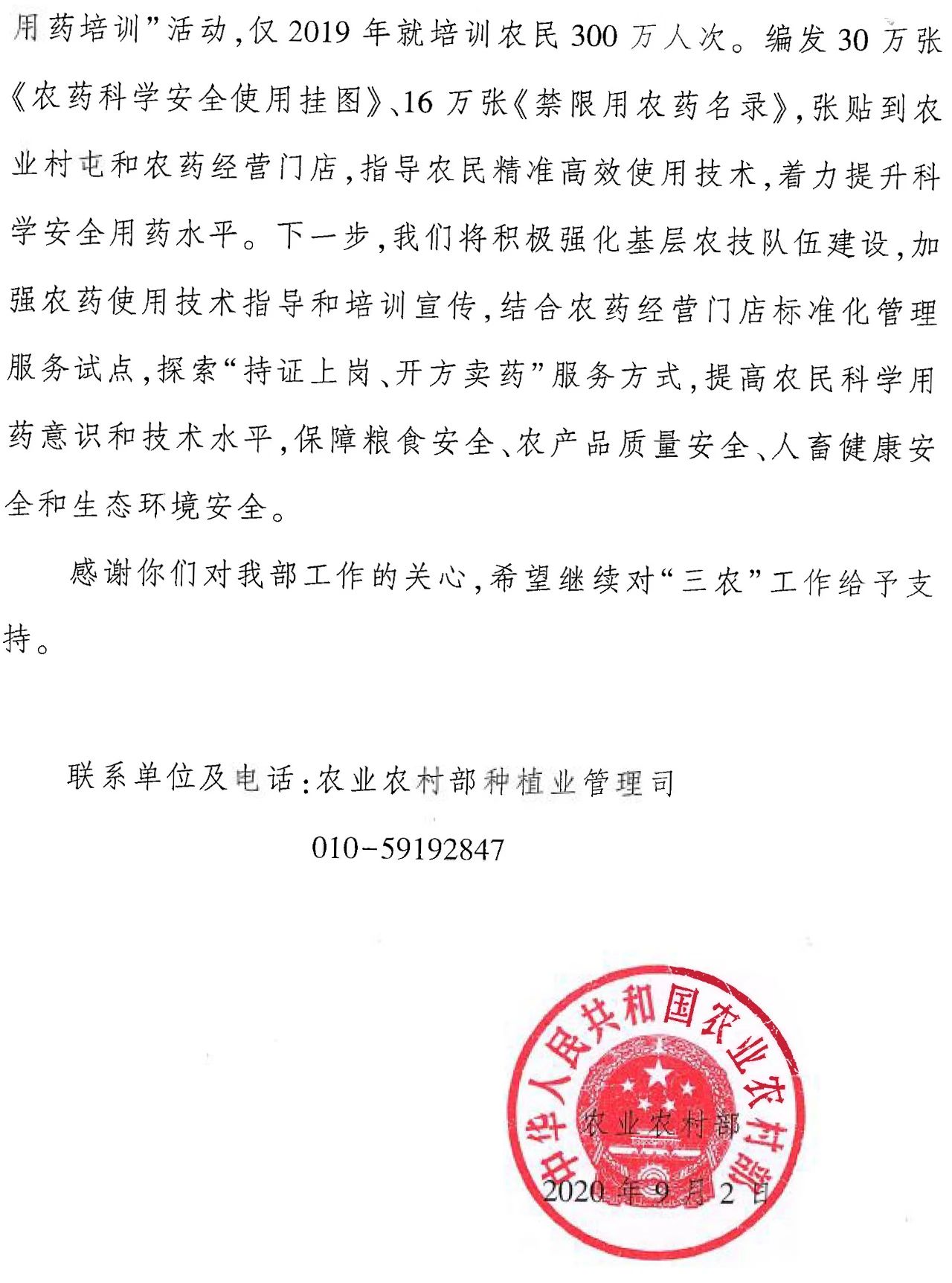 ? 同時,農(nóng)業(yè)農(nóng)村部加強科學安全用藥技術培訓和指導,從2012年開始,在全國組織開展“百萬農(nóng)民科學安全用藥培訓”活動,僅2019年就培訓農(nóng)民300萬人次。編發(fā)30萬張《農(nóng)藥科學安全使用掛圖》、16萬張《禁限用農(nóng)藥名錄》,張貼到農(nóng)業(yè)村屯和農(nóng)藥經(jīng)營門店,指導農(nóng)民精準高效使用技術,著力提升科學安全用藥水平。