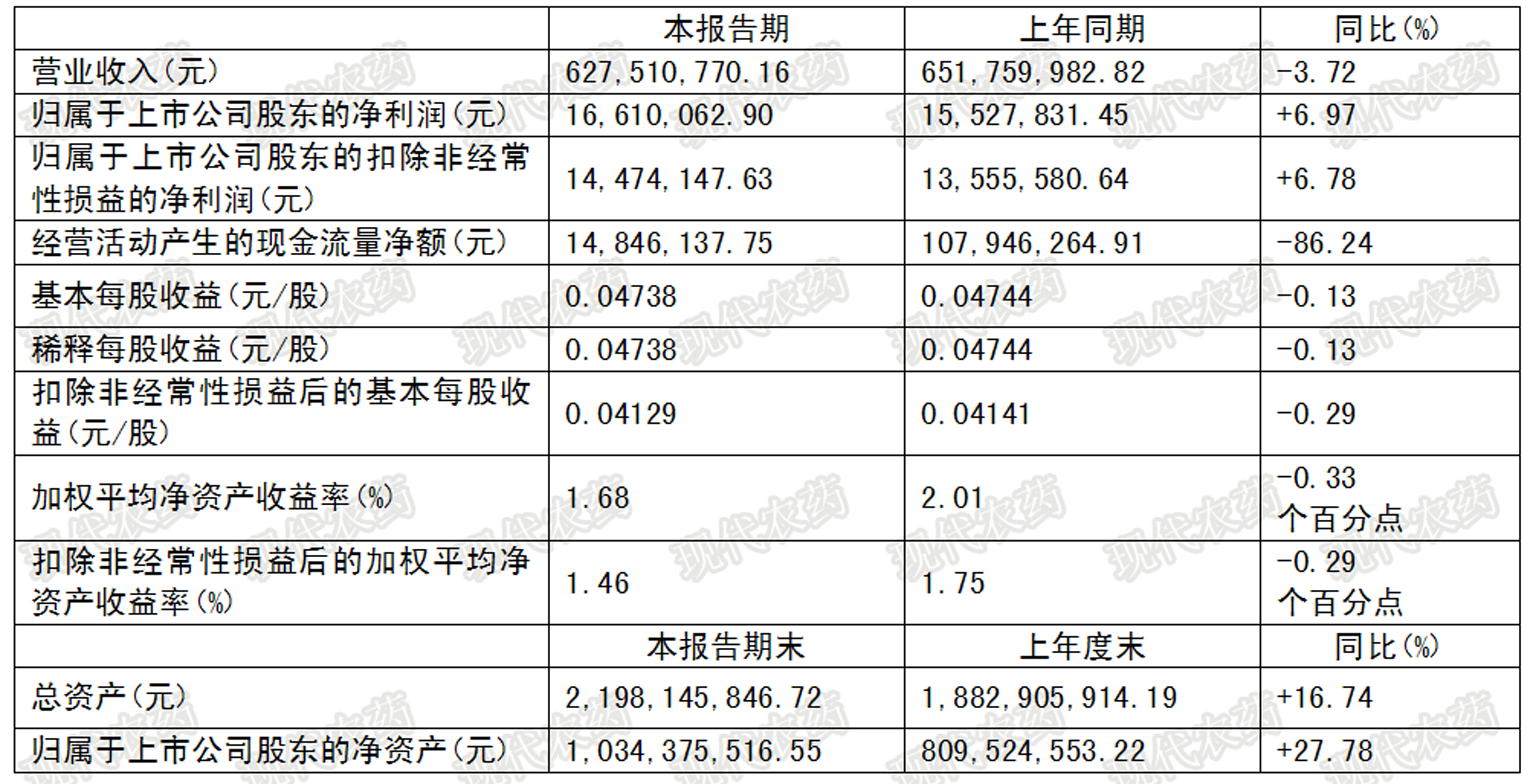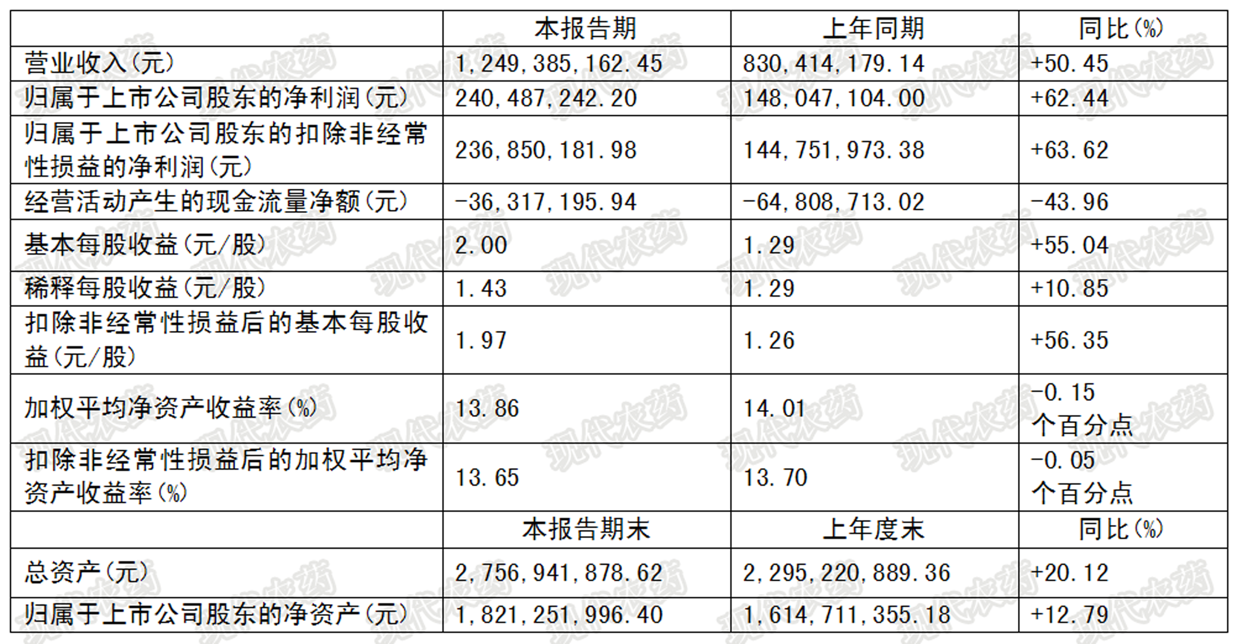 ??? 報告期內(nèi),公司實現(xiàn)合并營業(yè)收入124,938.51萬元,同比增長50.45%;實現(xiàn)歸屬于上市公司股東的凈利潤24,048.72萬元,同比增長62.44%。在此期間,公司取得高新技術(shù)企業(yè)證書;同時,公司自籌資金新建煙堿類殺蟲劑項目開工建設(shè)。