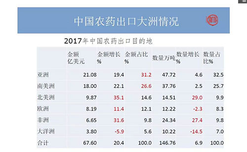 ??? 截止到2018年5月底,我國農藥出口額達到32.46億美元,同比2017年的24.40億增長33.0%;農藥出口量57.04萬噸,同比2017年的57.16萬噸,下降0.2%。. 其中,原藥出口額達到18.27億美元,同比2017年的13.68億增長33.5%;農藥出口量19.10萬噸,同比2017年的20.26萬噸,下降5.8%。. 其中,制劑出口額達到14.20億美元,同比2017年的10.72億增長32.4%;農藥出口量37.95萬噸,同比2017年的36.90萬噸,增長2.8%。