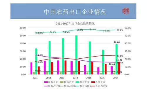 ??? 從出口企業(yè)性質來看,私營企業(yè)成為我國農藥出口的主體,出口額占比持續(xù)超過50%。2017年私營企業(yè)出口額38.66億美元,占57.2%;外資企業(yè)16.23億美元,占比24.0%;國有企業(yè)10.44億美元,占比15.4%;集體企業(yè)2.27億美元,占比3.4%。從2011年到2017年,私營企業(yè)和外資企業(yè)占比上升,分別上升3.4個百分點和7.4個百分點;國有企業(yè)和集體企業(yè)占比下降,分別下降9.4個百分點和1.4個百分點。