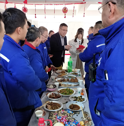 除夕當(dāng)日,凱源祥房雷華廠長、吳桂言副廠長、張述州處長、仇兆鵬副主任代表公司,向一線員工送出最誠摯的新年祝福。據(jù)統(tǒng)計,春節(jié)期間凱源祥堅守一線的員工共計140人,他們是海利爾的真英雄。值此佳節(jié),卻一心為公,用責(zé)任與擔(dān)當(dāng)墊起海利爾邁步向前的基石,展示著新時代海利爾人開拓拼搏的奮進精神。此時此刻,這個年相聚凱源祥,有人力行政處為堅守一線的家人們精心制作的美味年夜飯,有集團送來的香甜暖心的水果,有加油鼓勁的拔河活動,也有自告奮勇的上臺表演,多的是笑聲與陪伴,這個年我們也因此不孤單。在新的一年,凱源祥人將以礪刀鋒、站住崗、始向前的精神磨煉本領(lǐng),在董事長總裁的引領(lǐng)下,奮勇拼搏、激流勇進,奏響海利爾高質(zhì)量發(fā)展的時代樂章。