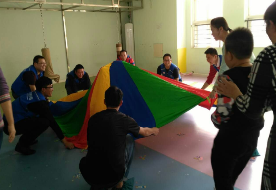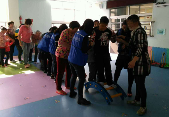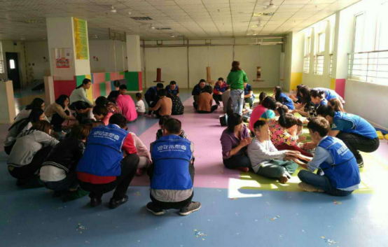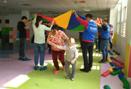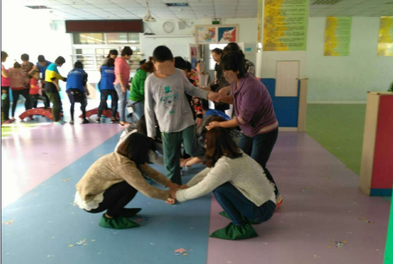 而后,在老師的指導(dǎo)下,志愿者們陸續(xù)開始和孩子們互動起來,協(xié)助家長一起做康復(fù)訓(xùn)練。到了孩子們的上課時間,志愿者們便一起做起了互動游戲。盡自己的最大努力去跟孩子們溝通、互動,別無他求,只愿他們開心、快樂!